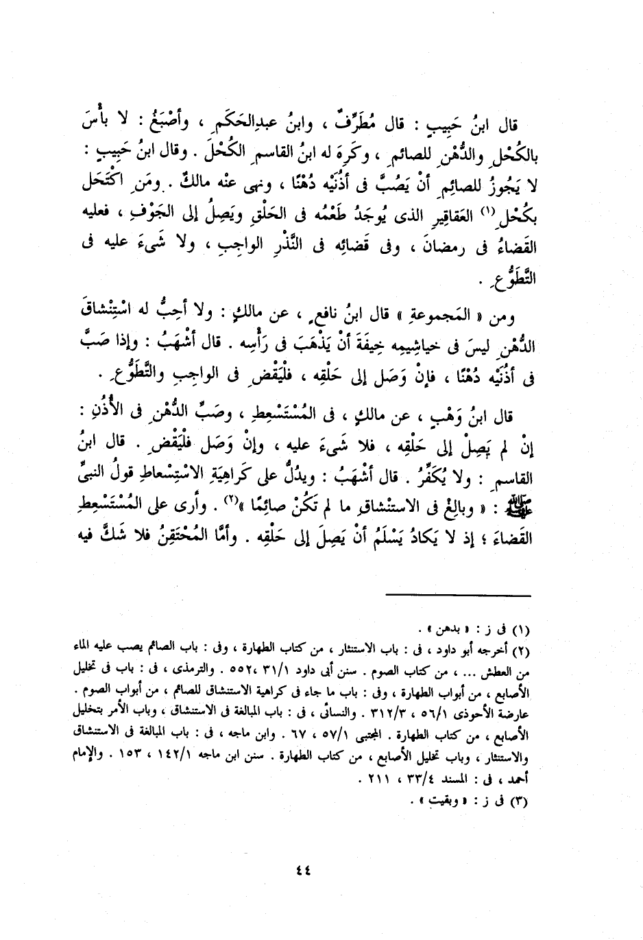 ومن "المَجْمُوعَة" قال ابن نافع، عن مالكٍ: ولا أحبُّ له استتنشاقَ الدُّهنِ ليس في خياشيمه خِيفةَ أنْ يذهبَ في رأسه. قال أشهب: وإذا صبَّ في أُذنيه دهناً، فإن وصلَ إلى حلقهِ، فليقضِ في الواجب والتطوُّعِ.