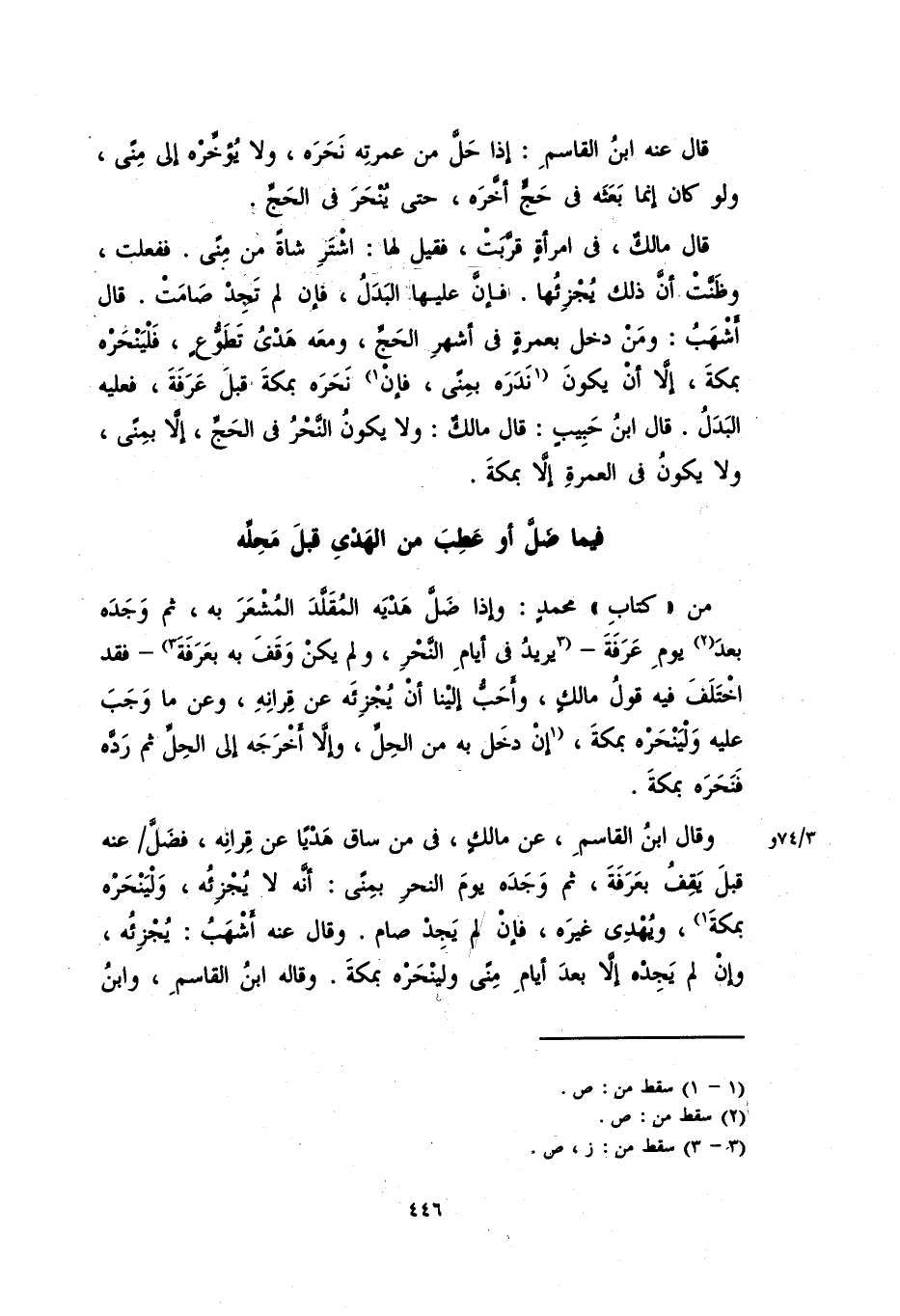من "كتاب" محمدٍ: وإذا ضلَّ هديه المقلد المشعر به، ثم وجده بعدَ يوم عرفة – يريد في أيام النحر، ولم يكن وقف به بعرفة – فقد اختلف فيه قول مالكٍ، وأحب غلينا أن يجزئه عن قرانه، وعن ما وجبَ عليه ولينحره بمكة، إن دخل به من الحلِّ، وإلا أخرجه إلى الحلِّ ثم ردَّه فنحره بمكة.