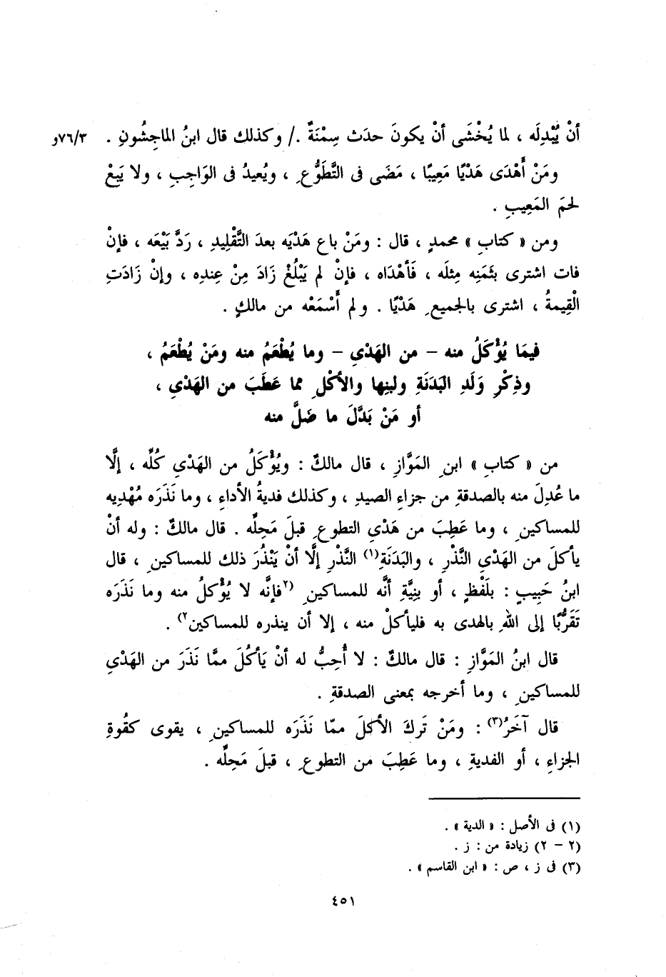 فيما يؤكل منه – من الهدي – وما يطعن منه ومن يطعم، وذكر ولد البدنةِ ولبنها والأكل مما عَطَبَ من الهدي، أو من بدَّل ما ضلَّ منه