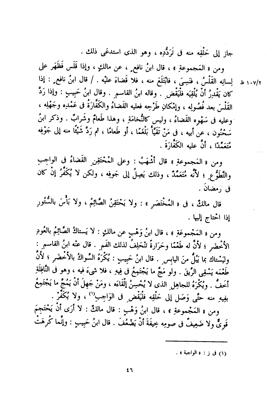 ومن "المَجْمُوعَة"، قال ابن نافع، عن مالك، وإذا قلس فظهر على لسانه القَلْسُ، فنسيَ، فابتلع منه، فلا قضاء عليه. قال ابن نافع: إذا كان يقدر أنْ يُلقيه فليقضِ. وقاله ابن القاسم. وقال ابن حبيب: وإذا ردَّ القَلْسَ بعد فصوله، وإمكان طرحه فعليه القضاء والكفارة في عَمده وجهله، وعليه في سهوه القضاءُ، وليس كالنُّخامة، وهذا طعام وشراب. وذكر ابن سحنون، عن أبيه، في مَنْ تقيَّأَ بلغماً، أو طعاماً، ثم ردَّ شيئاً منه على جوفه متعمداً، انَّ عليه الكفارة.