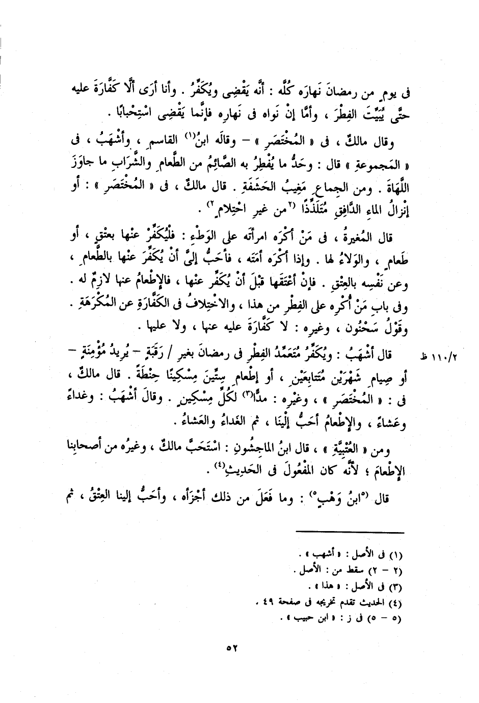 قال أشهب: ويُكفِّرُ متعمِّدُ الفطرِ في رمضانَ بغير رقبةٍ – يريد مؤمنةٍ – أو صيام شهرين متتابعين، أو غطعام ستين مسكيناً حِنطةٌ. قال مالك، في "المختصر"، وغيره: مدًّا لكل مسكين. وقال أشهبُ: وغداءً وعشاءً، والإطعام أحبُّ إلينا، ثم الغداءُ والعشاءُ.