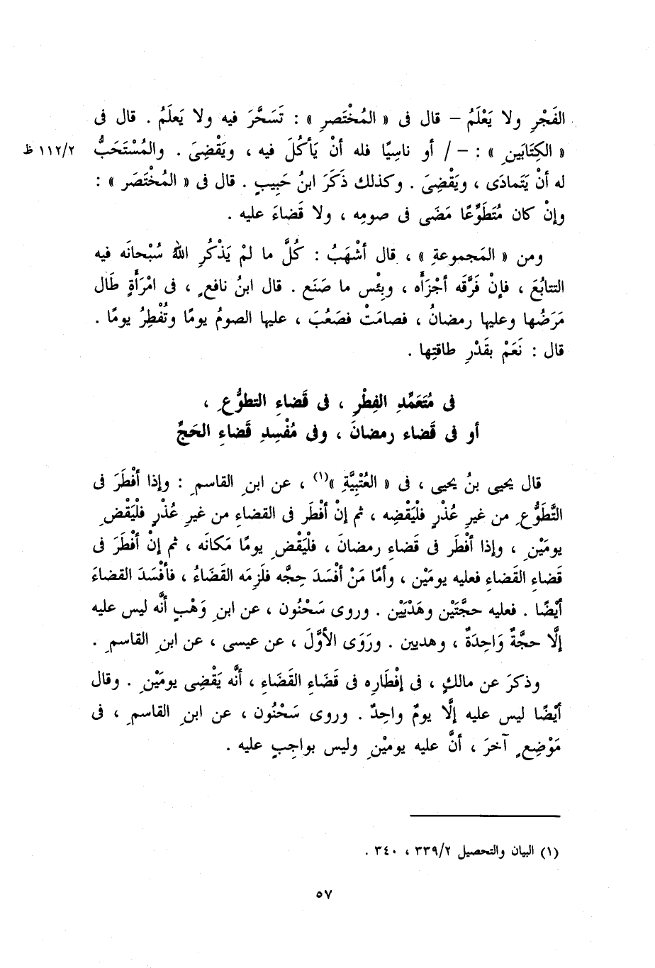 الفجرِ ولا يعلم – قال في "المختصر"" تَسَحَّرَ فيه ولا يعلمُ. قال في "الكتابين": أو ناسياً فله أَنْ يأكلَ فيه، ويقضيَ. والمستحبُّ له أَنْ يتمادى، ويقضيَ. وكذلك ذكر ابن حبيبٍ. قال في "المختصر": وإن كان متطوِّعاً مضَى في صومهن ولا قضاء عليه.