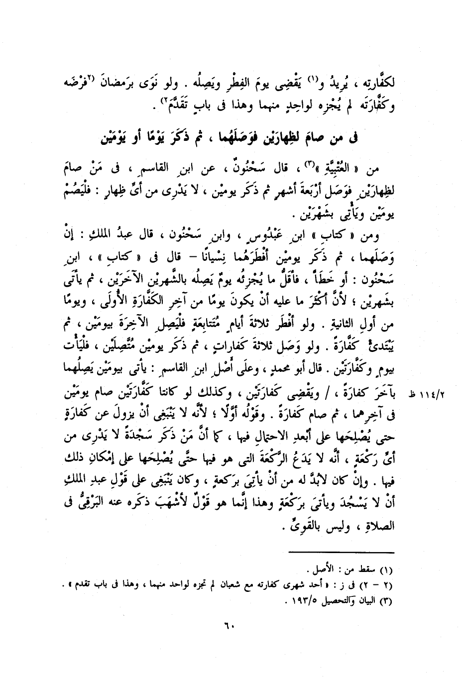 من "العُتْبِيَّة"، قال سحنون، عن ابن القاسم، في مَن صامَ لظهارين فوصل أربعة أشهر ثم ذكر يومين، لا يدري من أيِّ ظِهارٍ: فليصمْ يومين، ويأتي بشهرين.