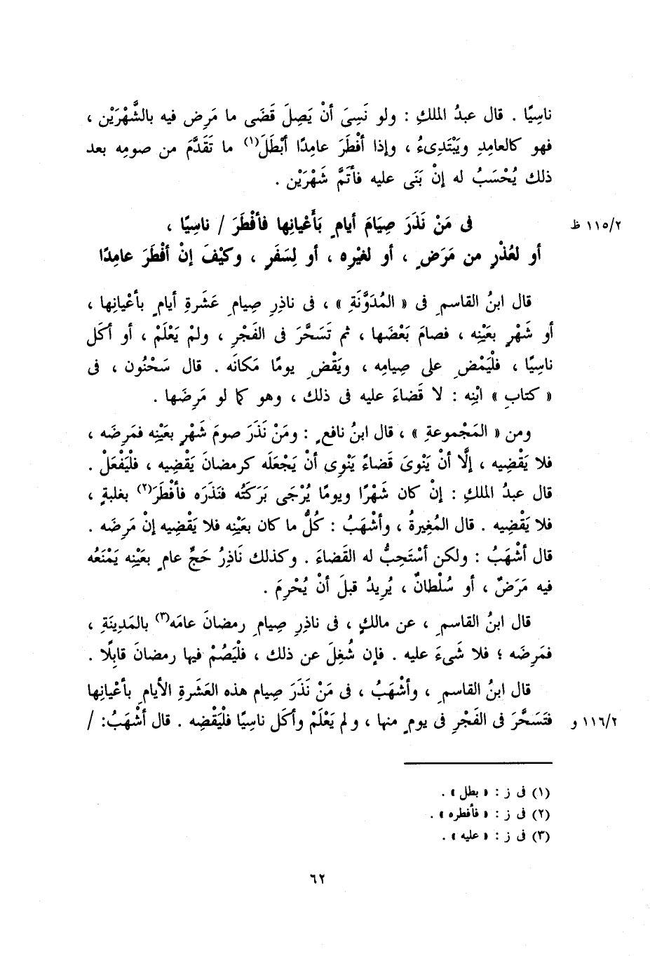 قال ابنُ القاسم في "المدونة"، في ناذر صيام عشرة أيام بأعيانها، أو شهرٍ بعينهِ، فصامَ بعضها، ثم تسحَّرَ في الفجرِ، ولم يعلمْ، أو أكل ناسياً، فليمضِ على صيامه، ويقضِ يوماً مكانه. قال سحنون، في "كتاب" ابنه: لا قضاءَ عليه في ذلك، وهو كما لو مرضها.