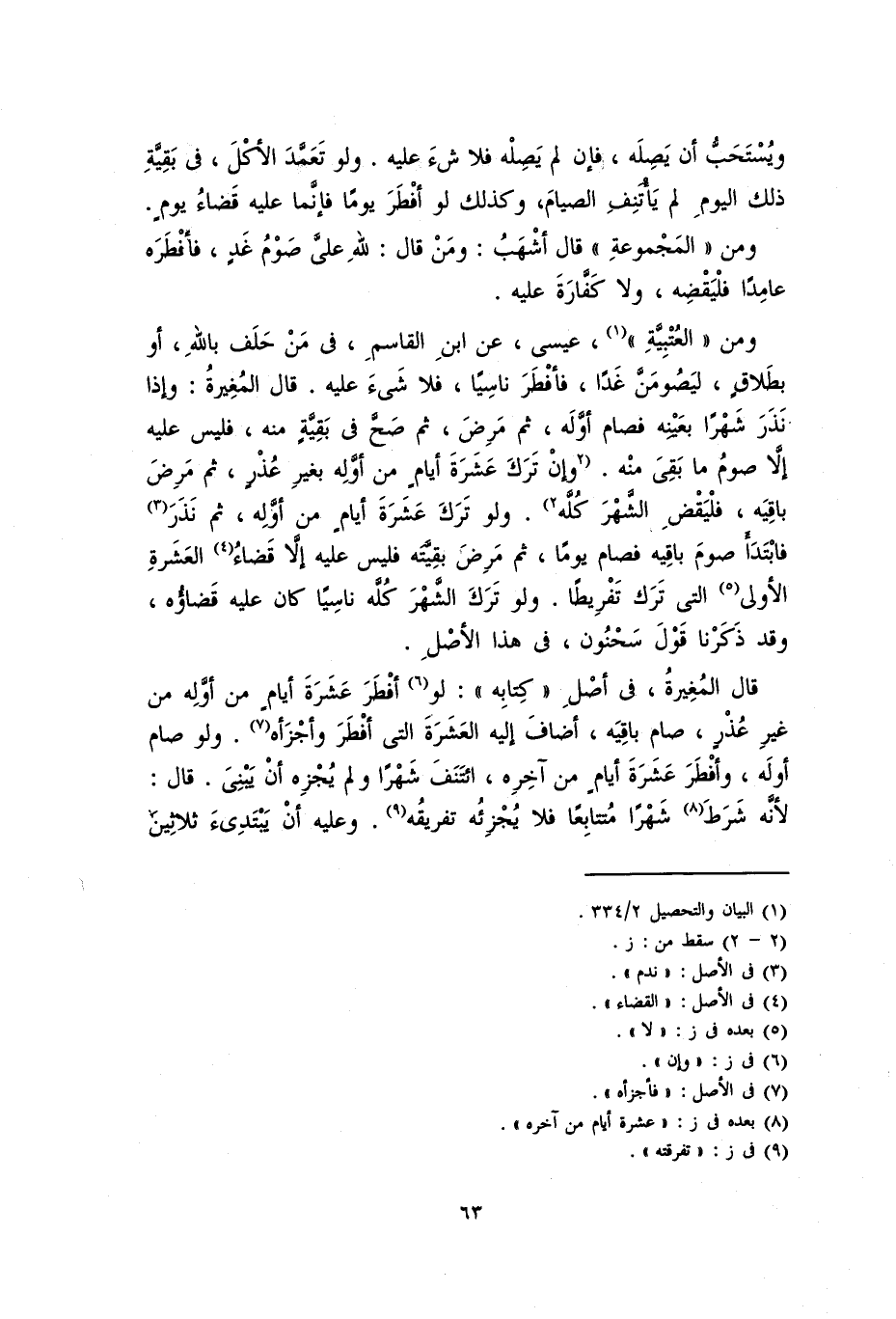 ومن "العُتْبِيَّة"، عيسى، عن ابن القاسم، فِي مَنْ حلف بالله، أو بطلاقٍ، لَيَصُومنَّ غداً، فأفطر ناسياً، فلا شيء عليه. قال المغيرةُ: وإذا نذرَ شهراً بعينه فصام أوَّلَه، ثم مرضَ، صمَّ صحَّ في بقيَّةٍ منه، فليس عليه إلا صومُ ما بقي منه. وإن تركَ عشرةَ أيَّامٍ من أوَّلِهِ بغيرِ عُذْرٍ. ثم مَرِضَ باقيه، فليقضِ الشهر كلَّه. ولو ترك عشرة أيامٍ من أوله، ثم نذر فابتدأَ صومَ باقيه فصام يوماً، ثم مرض بقيته فليس عليه إلا قضاء العشرة الأولى التي ترك تفريطاً. ولو ترك الشهر كله ناسياً كان عليه قضاؤه، وقد ذكرنا قول سحنون، في هذا الأصل.