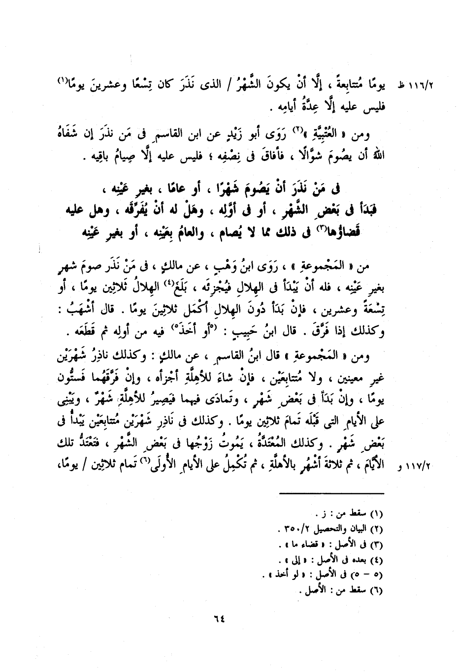 ومن "المَجْمُوعَة" قال ابنُ القاسم، عن مالكِ: وكذلك ناذِرُ شهرين غير معينين، ولا متتابعين، فإنْ شاء للأهلَّةِ أجزأه، وإن فرَّقهما فستُّونَ يوماً، وغ، بدأ في بعض شهرٍ، وتمادى فيهما فيصير للأهلَّةِ شهرٌ، ويبني على الأيام التي قبله تمام ثلاثين يوماً. وكذلك في ناذر شهرين متتابعين يبدأ في بعض شهرٍ. وكذبك المُعْتَدَّةُ، يموتُ زوجُهَا في بعض الشهر، فَتَعْتَدُّ تلك الأيام، ثم ثلاثة أشهرٍ بالأهلَّةِ، ثم تكمل على الأيام الأولى تمام الثلاثين يوماً،