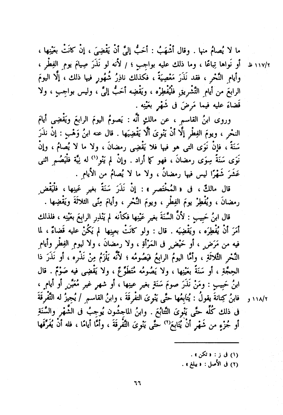 قال ابنُ حبيبٍ: لأنَّ السنة بغير عينها فكأنه لم ينذر الرابع بعينه، فلذلك أمرَ أنْ يُفطِرَه، ويقضيه. قال: ولو كانت بعينها لم يكن عليه قضاءٌ، لما فيه من مرضٍ، أو حيضٍ في المرأةِ، ولا رمضانَ، ولا ليومِ الفطرِ وأيام النحر الثلاثة، وأمَّا اليومُ الرابع فيصومه؛ لأنَّه يلزم من نذره، أو نذر ذا الحجة، أو سنة بعينها، ولا يصومه متطوِّعٌ، ولا يقضي فيه صومٌ. قال ابنُ حبيبٍ: ومَن نّرَ صومَ سنةٍ بغير عينها، أو شهرٍ غير معيَّنٍ أو أيامٍ، فابنُ كنانةَ يقولُ: يتابعها حتى ينويَ التفرقة، وابن القاسم يجيز له التفرقة في ذلك كله حتى ينويَ التتابع. وابن الماجشونُ يوجبُ في الشهر والسنةِ أو جزءٍ من شهرٍ أَنْ يتابع حتى ينويَ التفرقة، وأما أياماً، فله أَنْ يُفرِّقَها