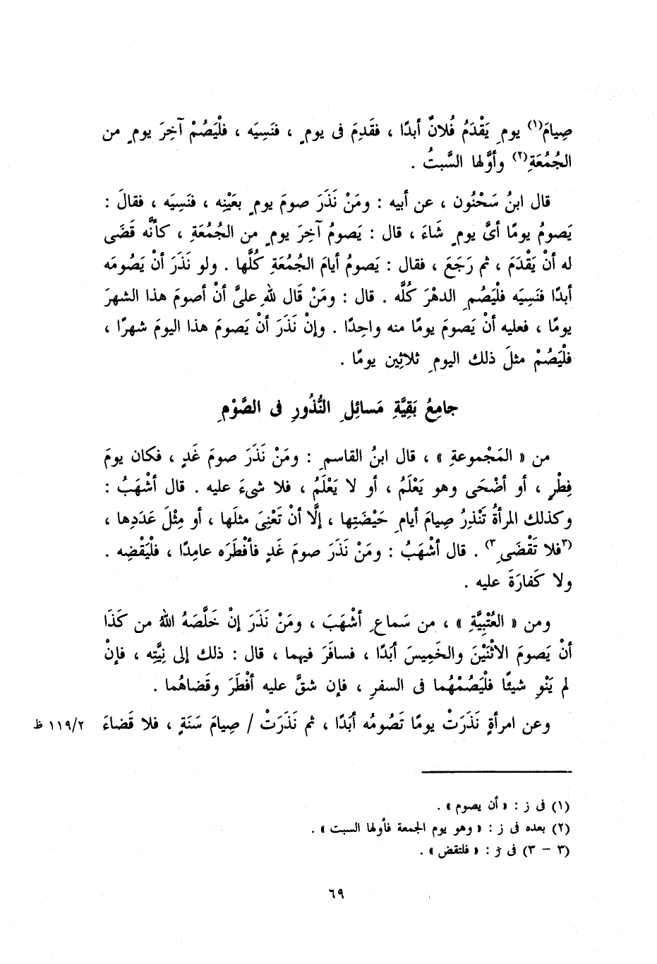 قال ابن سحنون، عن أبيه: ومن نذر صوم يومٍ بعينه، فنسيه، فقال: يصوم يوماً أيَّ يومٍ شاء، قال: يصوم آخر يومٍ من الجمعة، كأنَّه قضَى له أنْ يقدمَ، ثم رجعَ، فقال: يصوم أيام الجمعة كلها. ولو نذر أَنْ يصومه أبداً فنسيه فليصم الدهر كله. قال: ومن قال لله علي أن أصوم هذا الشهر يوماً، فعليه أَنْ يصوم يوما منه واحداً، وإن نذر أَنْ يصوم هذا اليوم شهراً، فليصم مثل ذلك اليوم ثلاثين يوماً.