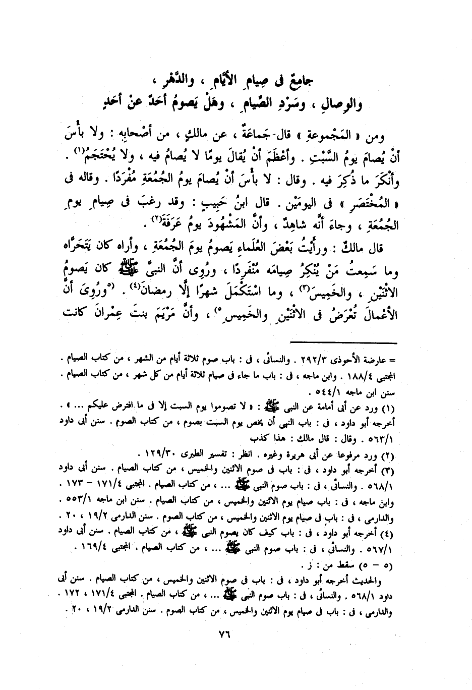 قال مالك: ورأيتُ بعضَ العلماء يصومُ يوم الجمعة، وأراه كان يتحراه وما سمعت مَن ينكر صيامه منفرداً، ورُوِيَ أنَّ النبي صلى الله عليه وسلم كان يصوم الاثنين، والخميس، وما استكملَ شهراً إلا رمضانَ. ورُوِيَ أنَّ الأعمال تُعرضُ في الاثنين والخميس، وأنَّ مريمَ بنتَ عمرانَ كانت