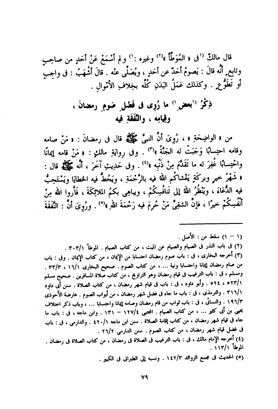 من "الواضحة"، رُويَ أنَّ النبي صلى الله عليه وسلم قال في رمضان: «مَنْ صَامَهُ وقَامه احْتِسَاباً وَجَبَتْ لَه الجَنَّةُ». وفي رواية مالكٍ: «مَنْ قامه إِيمَاناً واحْتِسَاباً غُفِرَ لَه مَا تَقَدَّمَ مِن ذَنْبِهِ». وفي حديثِ آخرَ؛ أنَّه صلى الله عليه وسلم قال: «شهرُ خيرٍ وبركةٍ يَغْشَاكُم اللهُ فيه بالرحمةِ، ويَحُطُّ فيه الخطايا ويَسْتَحِبُّ فيه الدُّعَاءَ، ويَنْظُرُ اللهُ إلى تَنَافُسِكُم، ويباهِي بكمُ الملائِكَةَ، فأَروا الله مِن أنفسِكُم خيراً، فإنَّ الشَّقِيَّ مَنْ حُرِمَ فيه رَحْمَةَ اللهِ». ورُوي أنَّ: النفقة