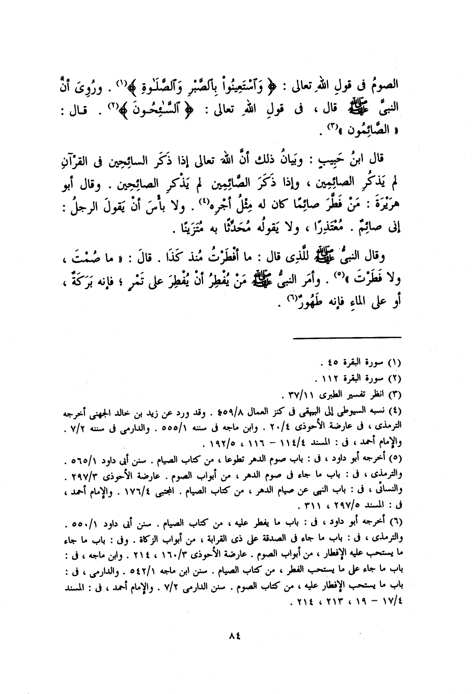 قال ابنُ حبيبٍ: وبيان ذلك أنَّ الله تعالى إذا ذكرَ السائحين في القرآن لم يذكر الصائمين، وإذا ذكر الصائمين لم يذكر الصائحين. وقال أبو هريرة: مَن فطرَ صائماً كان له مثل أجرهِ. ولا بأسَ أنْ يقولَ الرجلُ: إني صائمٌ. معتذراً، ولا يقوله مُحدِّثاً به متزيناً.