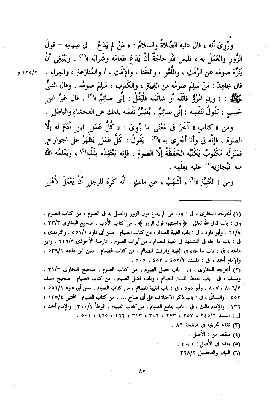 قال مجاهد: مَن سلِمَ صومُه من الغيبةِ، والكذبِ، سَلِمَ صومُه. وقال النبي صلى الله عليه وسلم «وإنِ امرؤٌ قاتَلَه أوْ شاتمَه فَلْيَقُلْ: إِنِّي صَائِمٌ». قال غيرُ ابنِ حبيبٍ: يقولُ لنفسهِ: إنِّي صائمٌ. يُصَبِّرُ نفسَه بذلك عن الفحشاءِ والباطلِ.