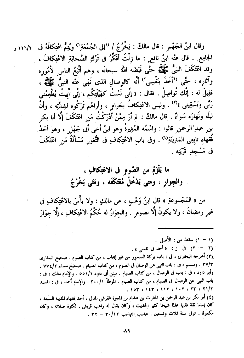 وقال ابنُ الجهمِ: قال مالكٌ: يخرجُ على الجمعةِ ويتمُّ اعتكافه في الجامعِ. قال عنه ابنُ نافعٍ: ما زلتُ أفكِّرُ في تَرْكِ الصحابةِ والاعتكافَ، وقد اعتكفَ النبي صلى الله عليه وسلم حتى قبضه الله سبحانه، وهم أتبعُ الناسِ لأموره وآثاره، حتى أخذ بنفسي أنَّه كالوصالِ الذي نهى عنه النبي صلى الله عليه وسلم، فقيل له: إنك تواصل، فقال: «إنِّي لستُ كهيئتكُم، إنِّي أَبِيتُ يُطعمنِي ربِّي ويَسقيني». وليس الاعتكافُ بحرامٍ، وأراهم تركوه لشدَّتِهِ، وأنَّ ليلَه ونهاره سواءٌ. قال مالكٌ: لم أرَ ممن أدركتُ مَنِ اعتكفَ إلاَّ أبا بكر بنَ عبد الرحمنِ قالوا: واسمُه المغيرةُ وهو ابن أخي أبي جهلٍ، وهو احَدُ فقهاءِ تابعي المدينة، وفي باب الاعتكاف في الثُّغورِ مسألةُ مَنِ اعتكفَ في مسجدِ قريتهِ.