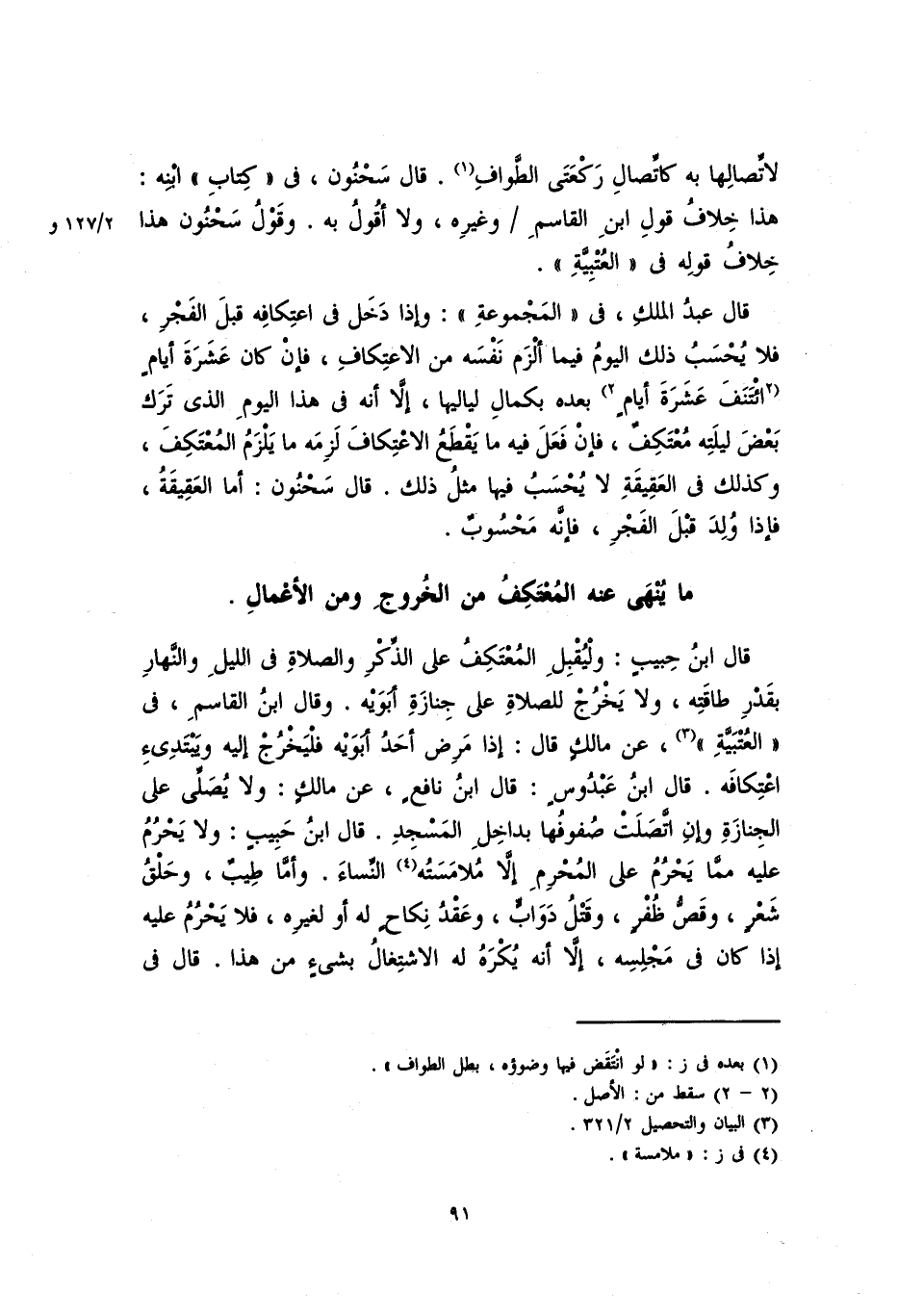 قال عبد الملك، في "المَجْمُوعَة": وإذا دخل في اعتكافه قبل الفجرِ، فلا يُحسب ذلك اليوم فيما ألزم نفسه من الاعتكاف، فإن كان عشرة أيام ائتنف عشرة أيامٍ بعده بكمال لياليها، إلا أنه في هذا اليوم الذي ترك بعضَ ليلتهِ مُعتكفٌ، فإن فعل فيه ما يقطعُ الاعتكاف لزمه ما يلزم المعتكف، وكذلك في العقيقة لا يُحسبُ فيها مثل ذلك. قال سحنون: أما العقيقة، فإذا ولد قبل الفجر، فإنه محسوب.