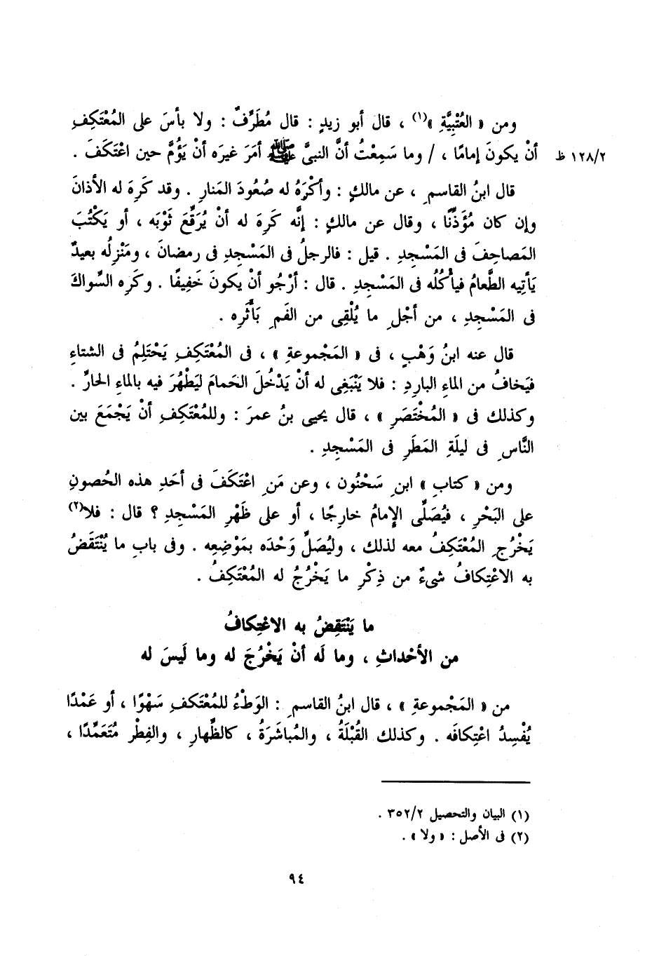 قال عنه ابن وهب، في "المَجْمُوعَة"، في المعتكفِ يحتلمُ في الشتاءِ فيخاف من الماء الباردِ: فلا ينبغي له أَنْ يدخل الحمام ليطهر فيه بالماء الحار.
