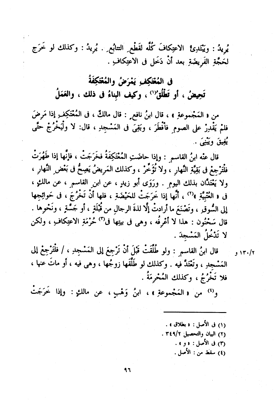 قال عنه ابن القاسم: وإذا حاضت المعتكفة فخرجتن فإنَّهَا إذا طَهُرَتْ فلترجع في بقية النهار، ولا تؤخر، وكذلك المريض يصحُّ في بعض النهار، ولا يعتدان بذلك اليوم. ورَوَى أبو زيدٍ، عن ابن القاسم، عن مالكٍ، في "العُتْبِيَّة"، أنها إذا خرجت للحيضةِ، فلها أن تخرج، في حوائجها على السوق، وتصنع ما أرادت إلا لذة الرجال من قُبلةٍ، أو جسَّةٍ، ونحوها.