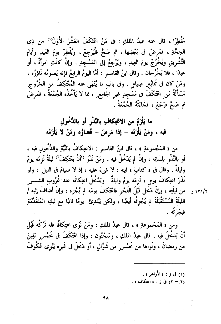 من "المَجْمُوعَة"، قال ابن القاسم: الاعتكافُ بالنيَّةِ والدُّخُولِ فيه، أو بالنَّذْرِ بلسانه، وإنْ لم يدخل فيه. ومَن نذر أنْ يعتكفَ ليلةً لزمه يزومٌ وليلةٌ. وقال في "كتاب" ابنهِ: لا شيء عليه، إذ لا صيامَ في الليلِ، ولو نذرَ اعتكاف يومٍ، لزمه يومٌ وليلةٌ. ويدخل اعتكافه عند غروب الشمسِ من ليلتهِ، وإن دخل قبل الفجر فاعتكف يومَه لم يُجزه، وإن أضافَ إليه الليلةَ المستقبلة لم يُجْزِئُهُ أيضاً، ولكن يبتدئ يوماً ثانياً مع ليلته المتقدمة فيجزئه.