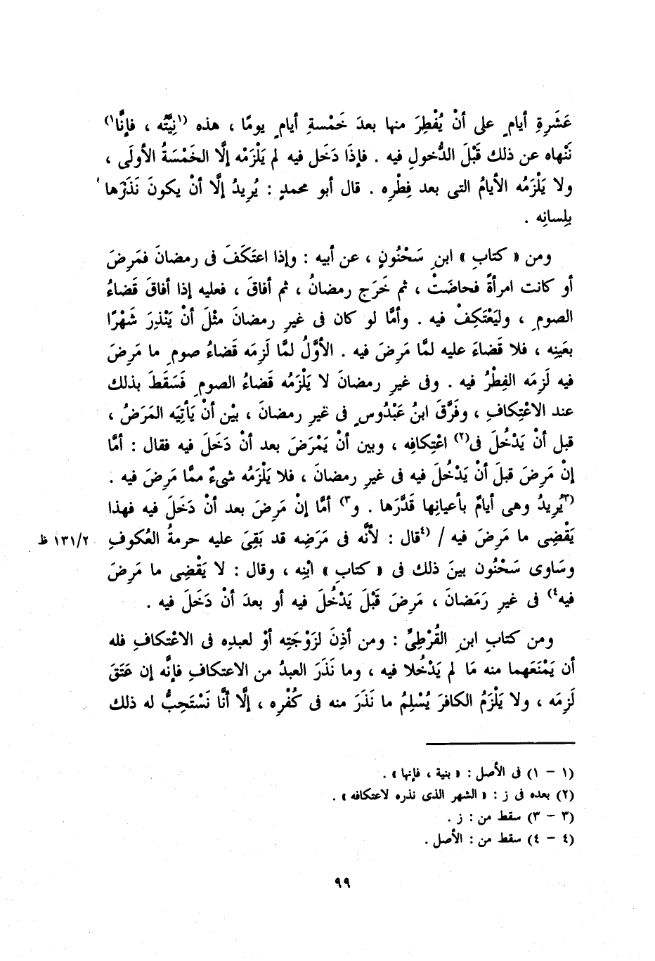 ومن "كتاب" ابن سحنون، عن أبيه: وإذا اعتكف في رمضان فمرض أو كانت امرأة فحاضتْ، ثم خرج رمضانُ، ثم أفاقَ، فعليه إذا أفاق قضاءُ الصومِ، وليعتكفْ فيه. وأمَّا لو كان في غير رمضانَ مثلَ أنْ ينذر شهراً بعينِهِ، فلا قضاء عليه لمَّا مرض فيه. الأوَّلُ لمَّا لزمه قضاءُ صومِ ما مَرِضَ فيه لزمه الفطر فيه. وفي غير رمضان لا يلزمه قضاء الصوم فسقطَ بذلك عند الاعتكاف، وفرَّقَ ابنُ عبدوسٍ في غير رمضانَ، بين أَنْ يأتيه المرضُ، قبل أَنْ يدخل في اعتكافه، وبين أَنْ يمرض بعد أن دخلَ فيه، فقال: أمَّا إنْ مرض قبل أَنْ يدخلَ فيه في غير رمضانَ، فلا يلزمه شيءٌ ممَّا مرض منه.