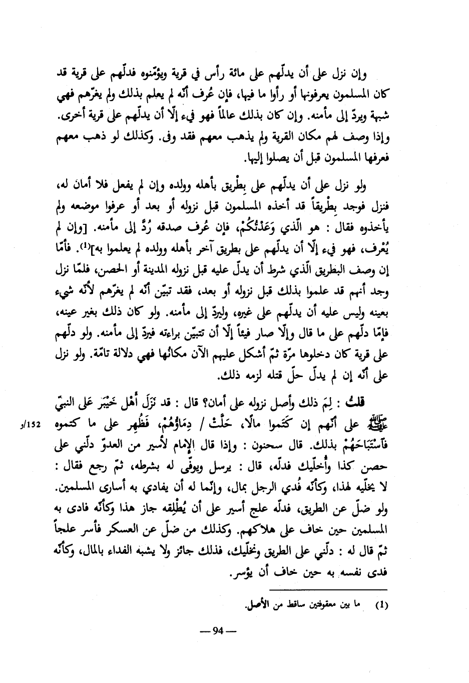 قال ابن سحنون عن أبيه: وإذا حصر المسلمون حصناً فأنزلوا منهم عشرة ليوافقونا على الأمان ورضي أهل الحصن والطاغية بما حكم العشرة , فنزل العشرة وسألوا المسلمين ترك السبي فأبوا اتفقوا معهم على أن أمنوا العشرة خاصة في أنفسهم وأموالهم وعيالاتهم وكتبوا بذلك كتاباً أشهدوا فيه ومضوا , ففتحوا الحصن ودخل المسلمون فسبوا , فقال الطاغية وأهل الحصن: إنما قال لنا العشرة إنكم أمنتم السبي فأنكر ذلك العشرة أو أقروا , أو شهد مسلمان أنهم قالوا لهم قد أمنوا السبي , فهذا كله لا ينفعهم وعقد العشرة قد تم لرضى الطاغية أولاً بما عقدوا عليه وعلى أهل مملكته , ورضاه وحده كاف لأن النبي - صلى الله عليه وسلم - إنما كان يكاتب سيد القوم والرؤساء لا العامة , ويصير كل من في الحصن وكل ما فيه فيئاً غير العشرة وأموالهم وعيالهم , وهم مصدقون في عيالهم وأموالهم إلا أن يأتوا بأمر مستنكر. وكذلك لو أخذ الطاغية وأهل الحصن الأمان حتى يرجع إليهم العشرة فذلك سواء.
