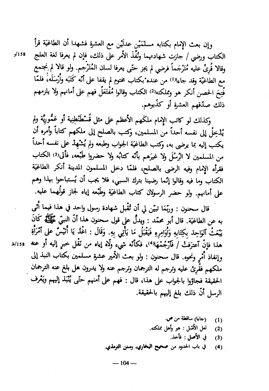 قال: ولما قتل أبو لؤلؤة عمر رحمه الله وقد كانت السكين التي طعنه بها رئيت قبل ذلك بيوم فى يد الهرمزان وهو صاحبه , فقال عبيد الله بم عمر فقتلهما فحبس وتكلم الناس فيه , وكان رأى عثمان ألا يقتل , فترك قبل أن يلي عثمان. قال عبد الملك بن مروان , فترى أنها أول مظلمة وقعت في الإسلام. وقال سحنون في أسير في وثاق يسور من الليل خزفاً مما يتقى وضجراً من الألم , فقال له حارسه لا تخف , أذلك له أمان؟ قال ليس ذلك بأمان له. وإنما هذا أمان لو قال له ذلك وهو مطلق هارب في الهزيمة.