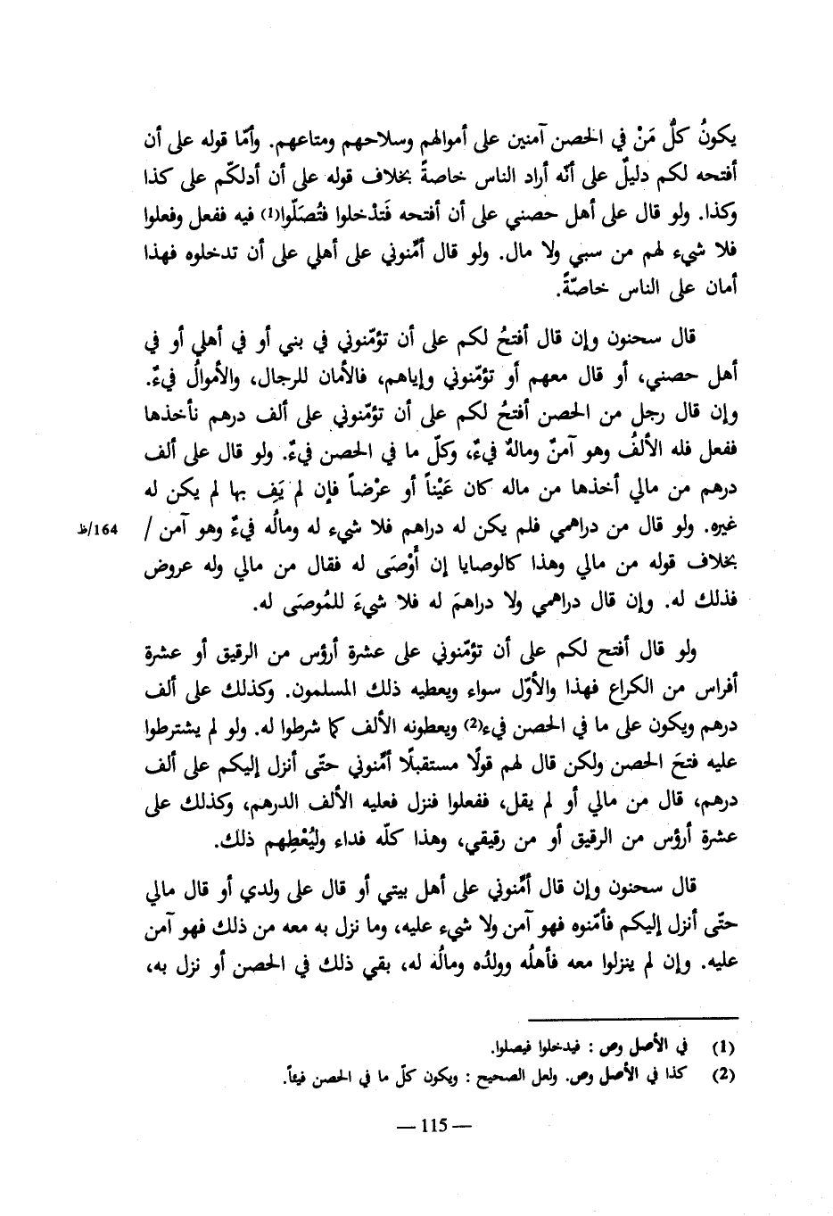 كان ذلك كفافاً ورأى الإمام أن ينزلهم ليأخذوا منهم ما بأخذ أهل الدين القيام ليردوا على المسلمين ما أخذوا من العشر في الدين , قال لا شيء على العدو ولا على الإمام لأنه أمر جرى على المصلحة فيمضي. وإذا كان الدين أكثر مما يؤخذ منهم , وجهل الإمام وأنزلهم على أن لا يعدى عليهم بدين , قال: فليف لهم بالشرط ولا يبطل الدين , ولكن يردهم إلى مأمنهم ولا يدعهم يقيمون على منع الدين.