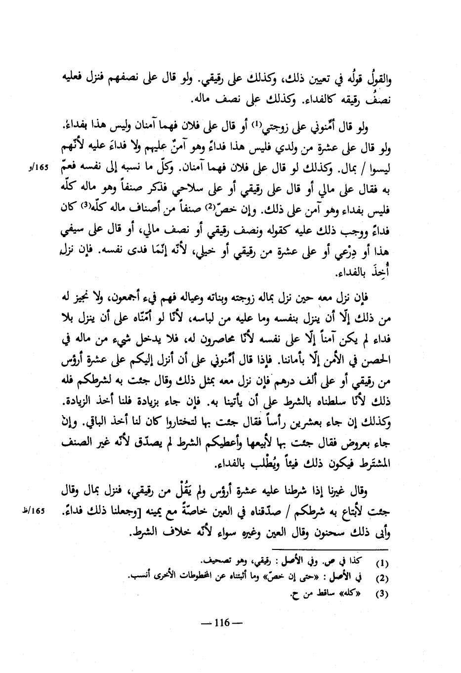 قال سحنون: وإذا قال رجل من الحصن أنزل على أن تؤمنوني على مائة دينار فرضوا فنزل فلم يعطهم وقال ما عندي فلا أمان له حتى يعطي المائة. فإن أبى فهو فيء إن شاء الإمام قتله أو استرقه. وكذلك على أن يعطيهم رأساً وإن لم يصفه ولهم رأس وسط أو قيمته فإن جاء بذلك فهو آمن يذهب حيث شاء من أرض الروم. فإذا بلغ مأمنه منها حل قتاله. وكذلك لو رجع إلى حصنه أو رجع إليه بعد أن بلغ مأمناً من بلد العدو إلا أن يشترط أنه آمن إلى أجل يذكره أو حتى يرجعوا إلى أرض الإسلام فله شرطه.