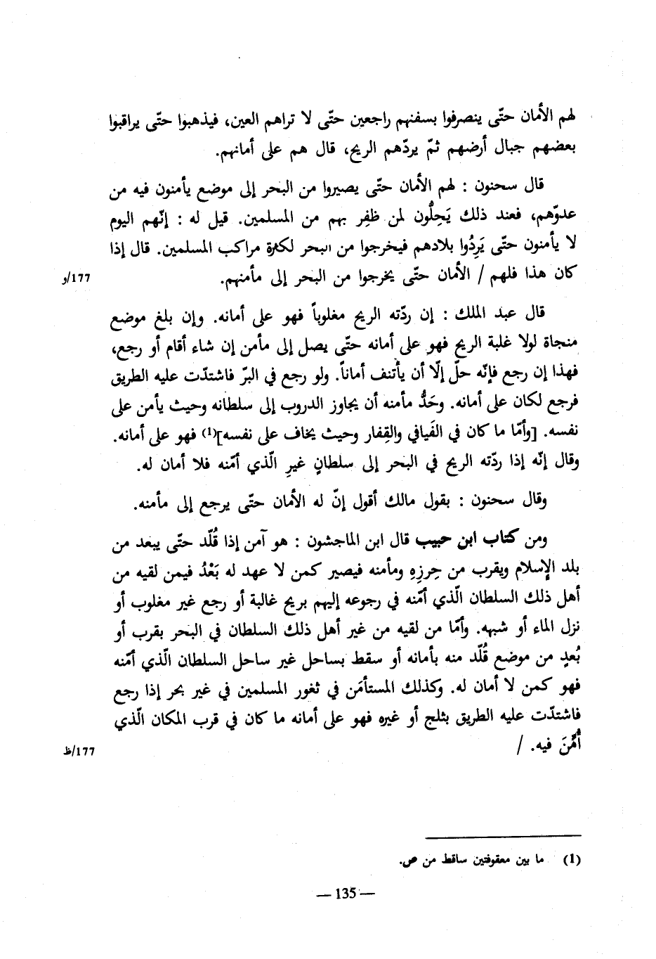 ومن كتاب ابن سحنون: وإذا قدم من بلد الحرب عبد كان أبق لسيده ومعه عبيد استألفهم وأنكر العبيد وقالوا نحن أحرار جئنا إلى أرض العرب ودين الإسلام , فجئنا معه على الصحبة وما أمن , قال: إن لم يكونوا في وثاق العبد فالقول قولهم , وعلى الإمام أن يفي لهم بعهد العبد إن أعطاهم عهداً أو يردهم إلى
