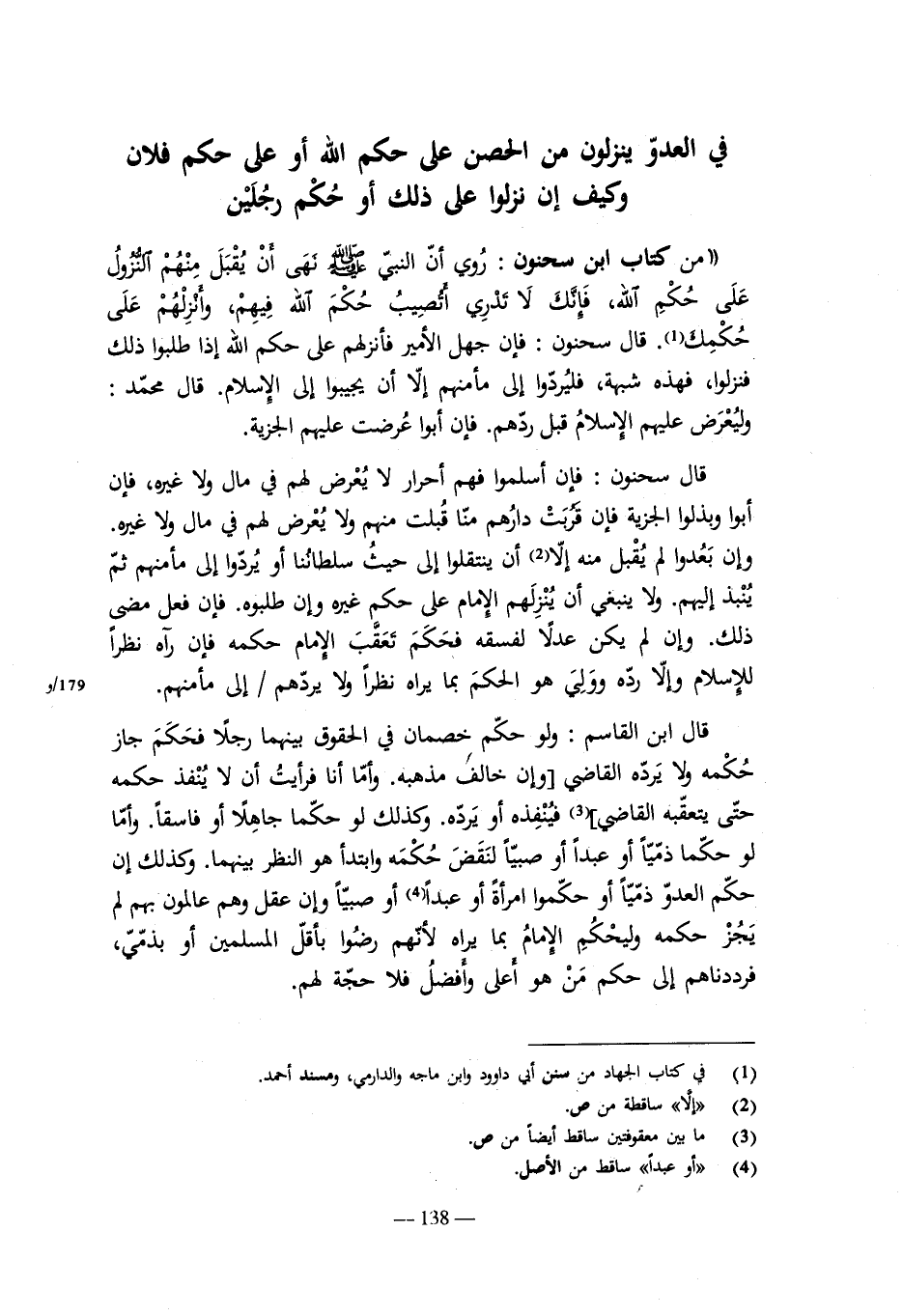 ومن كتاب ابن سحنون ذكر عن ابن القاسم مثل ما تقدم في المستأمن والذمي وقال: لا يعرض لهم في شرب الخمر وينهون عن إعلانه. وإن زنى رد إلى حكام دينه إلا أنه قال في جناية المعاهد لا عاقلة له: لأن العواقل على ثلاثة أوجه , عشيرة الجاني أو أهل جزية النصراني أو مسلم لا عشيرة له ولا ولاء كمن أسلم فعقله علي بيت مال المسلمين وميراثه لهم , والمعاهد ليس من هذه الأوجه , فذلك في ماله وإلا ففي ذمته , ولإمام منعه من الرجوع حتى يؤديها أو يبعث إلى بلده في ذلك إلا أن الدية عليه في ثلاث سنين مؤجلة. وقال أشهب: فإن أبوا أن يبعثوا إليه شيئاً فإنما عليه بقدر ما يلزمه معهم لو أطاعوا على اجتهاد الإمام , وقال سحنون: بل ذلك في ذمته.