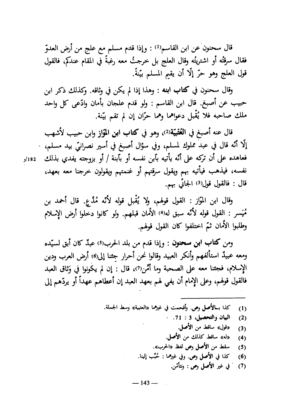 الذى بأرض الشرك شىء وإن أدركه بأيدى المسلمين. قال: وإما ما له أو عليه ببلدنا من دين أو وديعة أو رهن فليحكم له وعليه فى ذلك بحكم الإسلام. وإن مات عندنا أو كان حياً ولحق بأرض الحرب فمات أو قتل فتؤخذ منه الحقوق ويؤخذ له، وما فضل رد إلى ورثته. ولو أسر فصار عبداً كان ما فضل للمسلمين فيئاً فى قول ابن القاسم. وكذلك لو نقض العهد عندنا فقتل كان ما فضل بعد قضاء ديونه فيئاً فى بيت المال. ولو كان معه أم ولده فأسلمت ورجع إلى دار الحرب فلتعتق عليه إذا قال أنها أم ولدى ويتبعها ولدها. قيل: لا تعتق وتوقف حتى يسلم أو يموت.