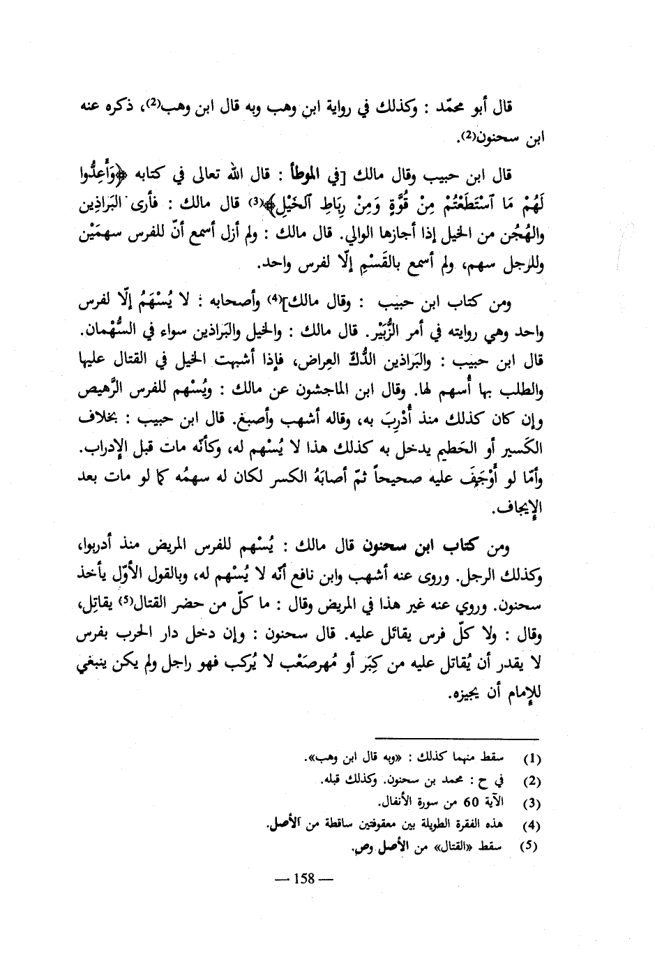 بقدر المسافة وبقدر إثخأنهم فى القتال وبقدر الخوف. قال سحنون: صواب ومن أعار رجلاً فرسه ليدخل به وليقاتل عليه لم يكن له نزعه منه قبل أن يقاتل، ثم إذا قاتل فله أخذه منه فيكون فيما يغنم بعد ذلك فارساً. ولو منعه منه أو جحده حتى فرغت المغانم فله حكم الغاصب.