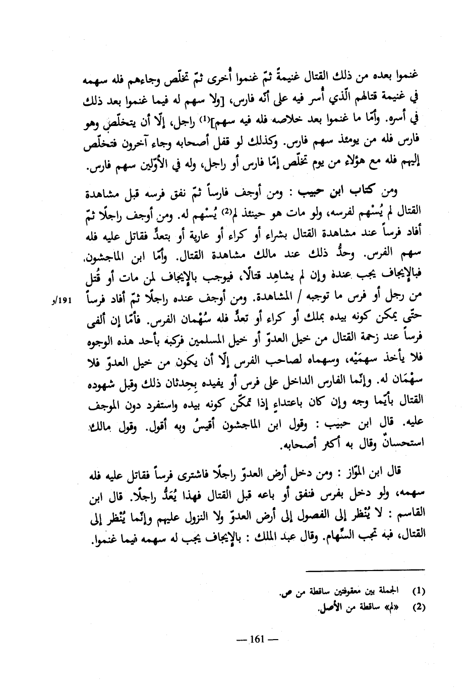 قال ابن المواز قال ابن القاسم عن مالك فى المراكب تفصل إلى أرض العدو ثم يرد بعضها الريح إلى أرض الإسلام ولم يرجع أهلها من قبل أنفسهم، فإن لهم سهمانهم مع أصحابهم الذين وصلوا إلى أرض العدو وغنموا. قال عبد الملك: وكذلك لو كان سلطانهم الذى ردته الريح فسلطأنه عليهم قائم والغنيمة له ولمن معه كما لو حضروا القتال.