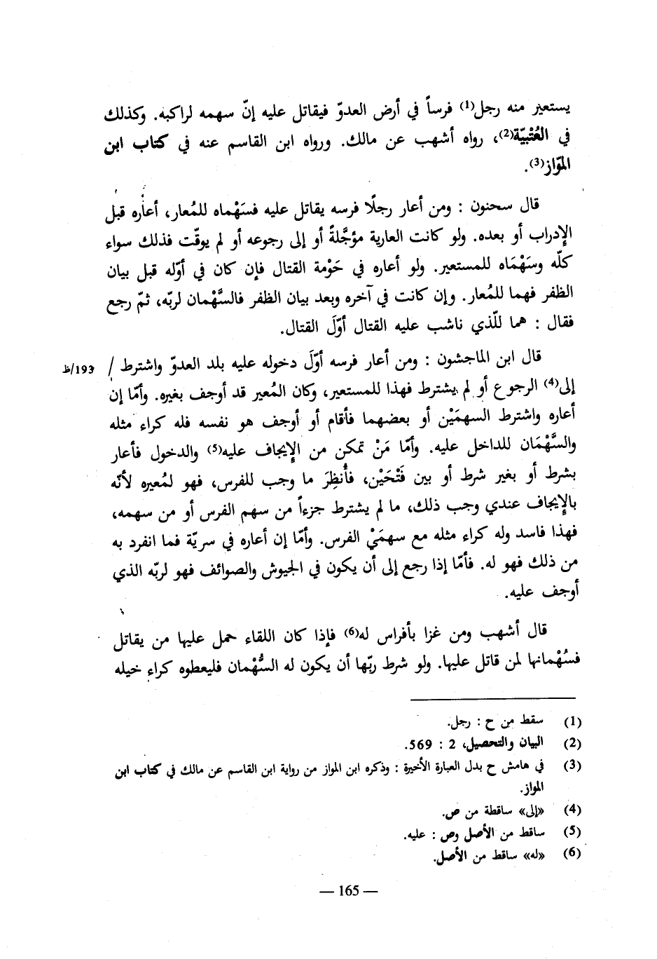 الثلاثة إلى موضع الموعد فأقاموا عشرين يوماً للموعد فلم يأتوا، فذهبوا إلى بلد الإسلام ثم طاب الريح للمركبين فأتوا أيضاً وقد غنموا أو لم يغنموا، فتنازعوا فيما غنمت الثلاثة مراكب وفيما غنم هؤلاء، قال: ذلك كله بينهم وقد ثبتت شركتهم لنصر بعضهم بعضاً، وأمرهم واحد وللفارس منهم سهمه وللراجل سهمه.