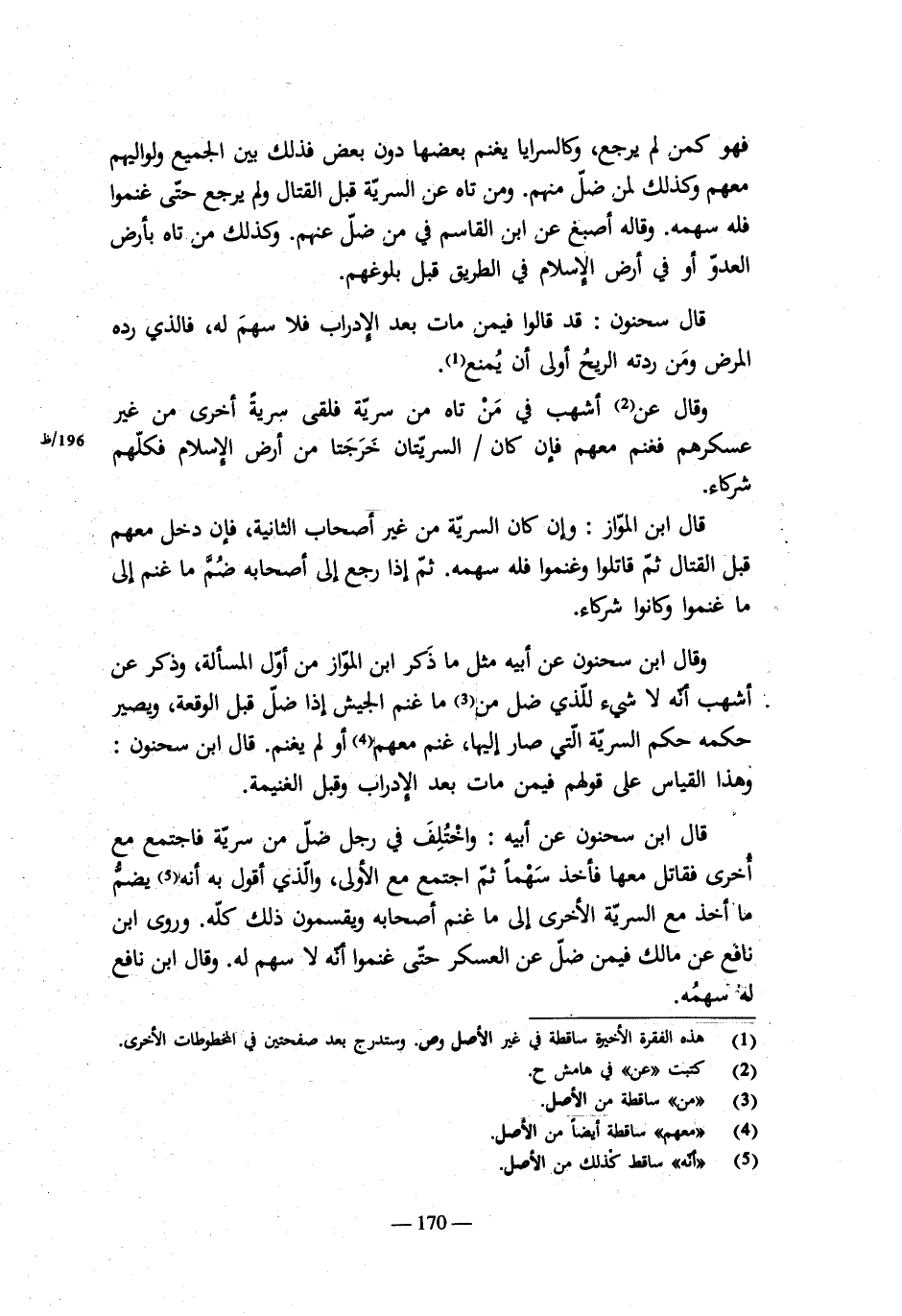 ولو خرج عسكر بوال إلى أرض الحرب فغنموا ثم خرج عسكر آخر بإمام إلى جهة آخرى ثم اجتمع العسكران، وقال فى موضع آخر فى الجيش يغنم ثم يلحقهم جيش آخر قبل يخرجوا إلى بلد الإسلام ثم اجتمعا بأرض الحرب، قال فى الموضعين ثم خرجوا، فإن كان الأولون فى خوف فاجتمع العسكران للمعونة على السلام ة والخلاص بأنفسهم وما معهم فما غنمن كل جيش (فبينهما. وكذلك لو لم يغنم إلا أحدهما فهو بينهما. ولو كان كل جيش) فى قوة لا يحتاج إلى معونة الآخر لم يدخل كل جيش فيما غنم الآخر. وإذا بعث الإمام من العسكر سرية ثم غنم العسكر بعدهم، فكل ما غنم وغنمت سراياه بين الجميع، يدخل بعضهم فيما غنم بعض.