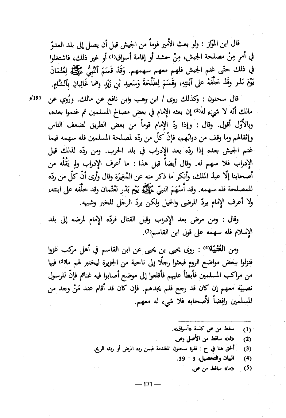 ولو أتبعهم الخارجون رجالةً حتى أبعدوا ثم غنموا، فإن كانت خيلهم منهم بموضع يمكنهم المعونة بها لو احتاجوا وأرسلوا فيها لقرب المكان فللخيل سهمانها فى قياس قول سحنون. وإن كانوا ببعد ولا يمكنهم عون أهل العسكر (لو أرادوا فليسهم للخارجين على أنهم رجالة ولا شىء لأهل العسكر) فيها إلا أن يكون الإمام حبسهم بالمكان خوفاً لما لا يأمن من رجعة العدو فيحولوا بينهم وبين المدينة، فلأهل العسكر مشاركتهم وإن بعدوا. وكذلك لو طلبهم القوم على إلابل والبغال والحمير وتركواخيلهم فإنتهوا مسيرة يوم ويومين أو أكثر فليضرب لهم بسهم الرجالة.