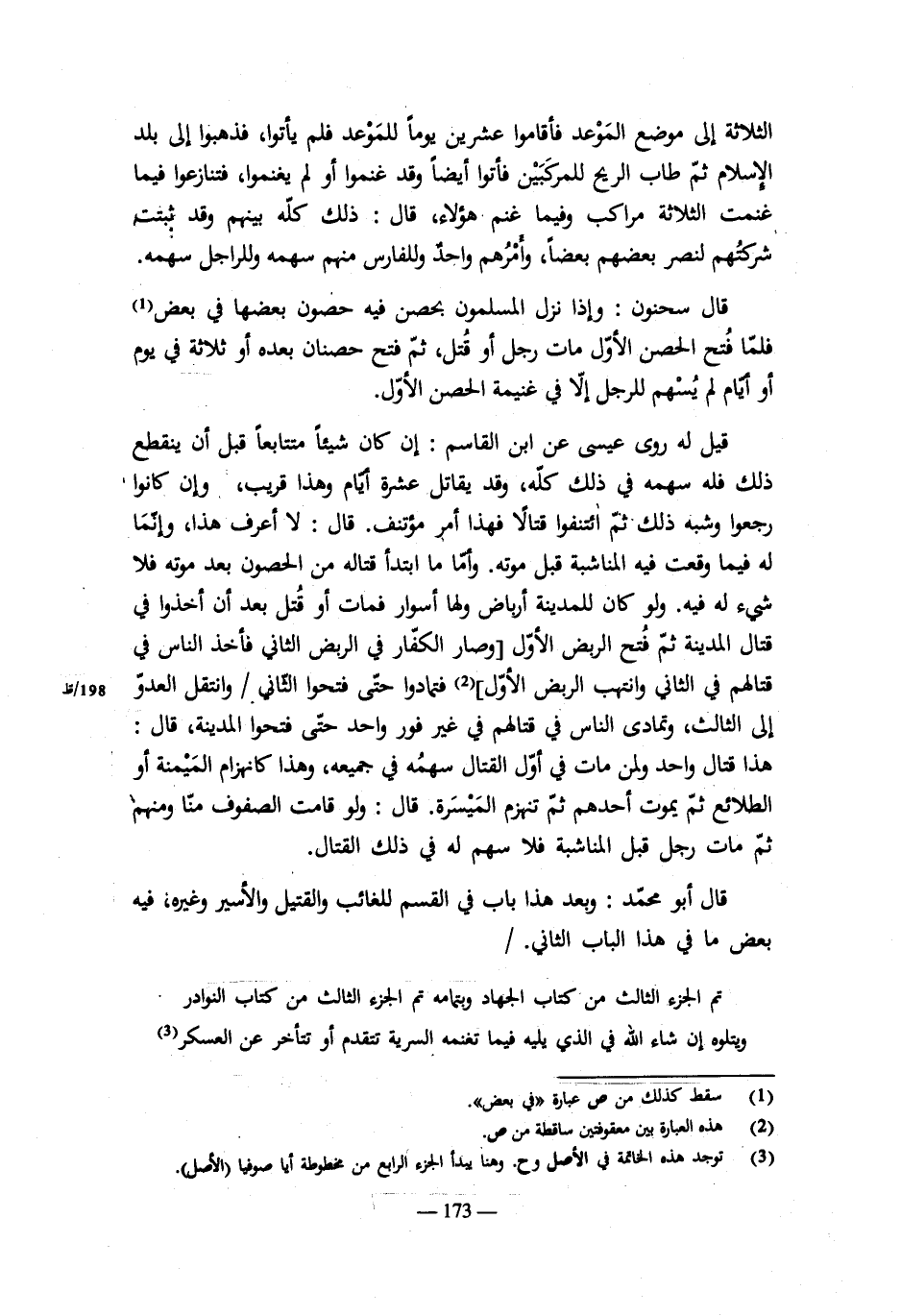 أهلمنازل شتى، قال: إن كانت مسالح منصوبة للرباط أهلها مقيمون بها لذلك فما غنم بين أهلتلك المسالح من خرج منهم ومن لم يخرج ومن قاتل ومن لم يقاتل. وكذلك إن كانوا من أهلحصن فى رأس الثغر. وإما إن كانت قرى فيها أهلها بعيالهم فالغنيمة بين كل من خرج ممن (أدرك القتال أو لم يدركه إذا ثبت بالبينة أنهم ممن خرج، وليس لمن لم) يخرج من أهلالقرية شىء. وذكر هذه الرواية ابن سحنون لأبيه فأعجبته.