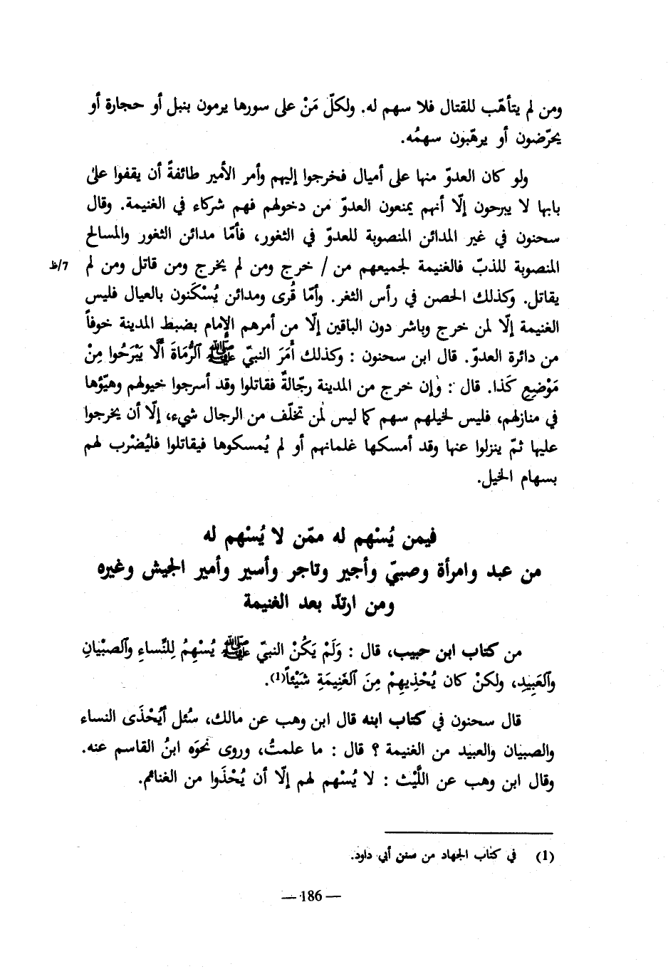 قال محمد وقاله أصحابنا إلا عبد الملك وحده فأنه قال: إلا أن يخشى من ذلك فى السرية ضيعةً من مبادرتهم إلانصراف وطرح بعضهم النفل على بعض فيتماحكون فى ذلك وتقل طاعتهم لصاحب السرية، فما جاء من هذا وغيره مما له وجه فله أن يبيع ويحوط من اشترى شيئاً متاعه، ويثبت البيع على من غاب من الجيش. فإما إن لم يكن هذا فلا حتى يبلغ بذلك مجمع الجيش إذا كان ببلد العدو ثم لا يتأنى فيه ولى الجيش أن يقسمه أو يبيعه. قال: وله قسمة ذلك بالبيع حسب ما يمكن ويتهيأ له. والقسم أن يقسم كل صنف على خمسة أسهم، والرقيق كذلك: ويجعل وصيف وصيف حتى يعتدل ذلك، ثم يجعل كذلك النساء المشتبهات ثم الذكران. فإذا اعتدل ذلك بالإجتهاد برأى النظر بالقيمة وإلاقتسأم، (ثم) يسهم عليها ويكتب فى سهم منها الخمس أو لله، أو لرسول الله.