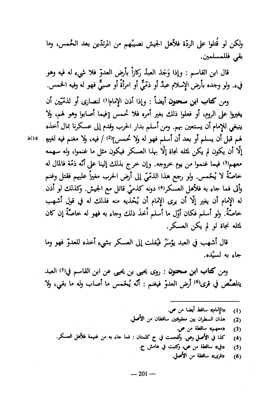 وأمر النبى صلى الله عليه وسلم بأداء الخيط والمخيط إلا ما ينتفع به ثم يرده إلى المغنم إن استغنى عنه. فإن بقى معه شىء لم يعلم به حتى رجع تصدق به وإن قل. وما صاد بأرضهم من طير ووحش وحوت فهو أحق به وبثمنه. وإن شاء خرج به إلى أهل. وإن واسى به فهو أحب إلينا وليس بلازم، وهو شىء لم يملكه العدو. وإما الصقور والبرازة وما يصاد به مما يعظم قدره فليرد فى المقاسم، ولا يكون لمن صاده أن يخرج به. وإن باعه رد الثمن فى المغنم.