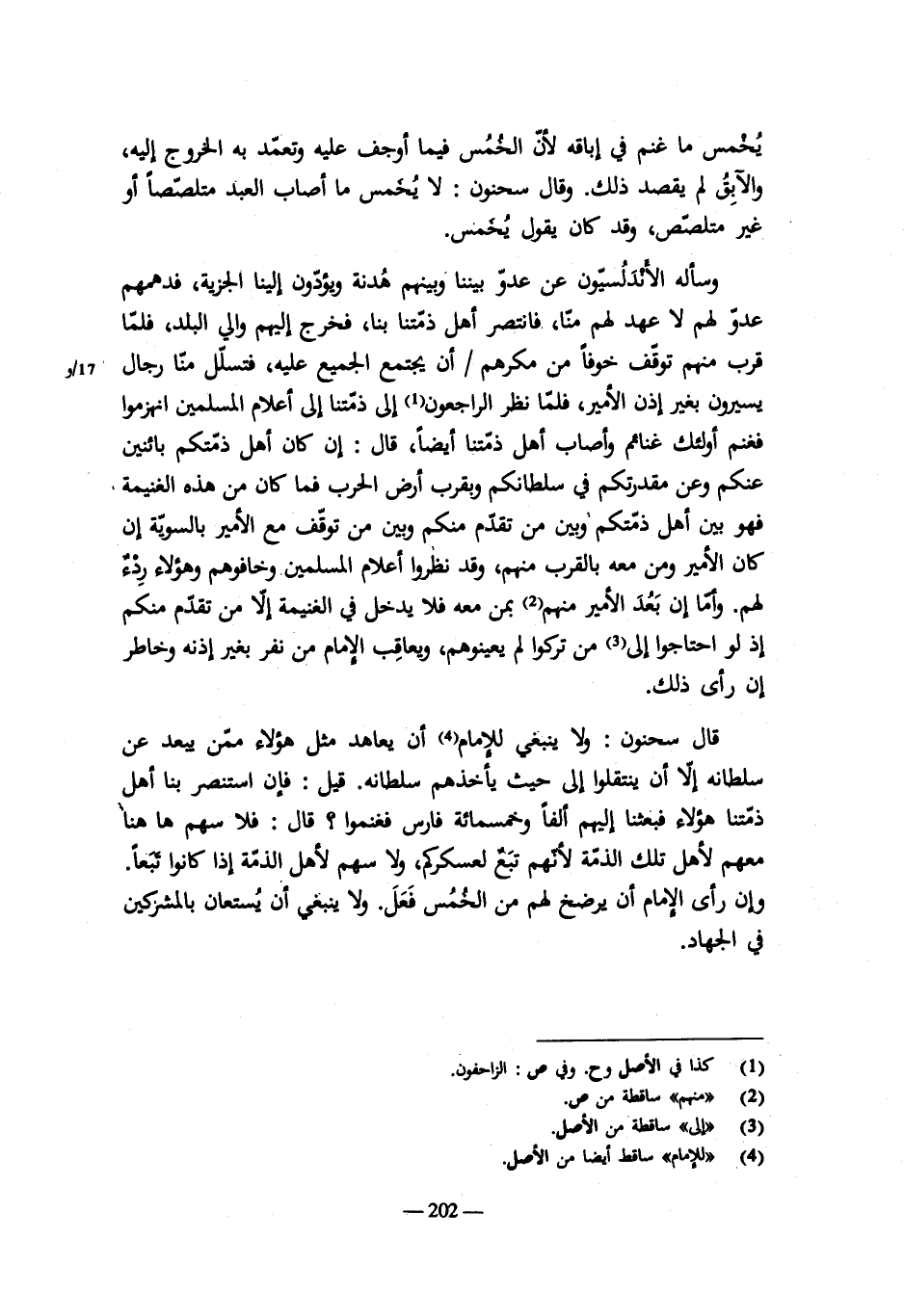 وهذا/قول كثير التابعين، وقاله مالك وأصحابه إلا ابن القاسم، فقال: كل ما نض من هذا مما عمله من شجرهم ورخأمهم وترابهم صار مغنماً. قال ابن حبيب: وإما الهر فإن وجد به ثمن بيع ورده فى المغنم وإلا أخذه من شاء. وإما الحمأم فله ثمن ويجعل مغنماً. وخفف بعض العلماء الهر والحمأم. وإما الكلب فإن كان صائداً بيع فى المقاسم. فإن لم يوجد له ثمن أخذه من شاء. وإن لم يؤخذ فليقتل. وإما غير الصائد مما لم يرخص فيه فليقتل.
