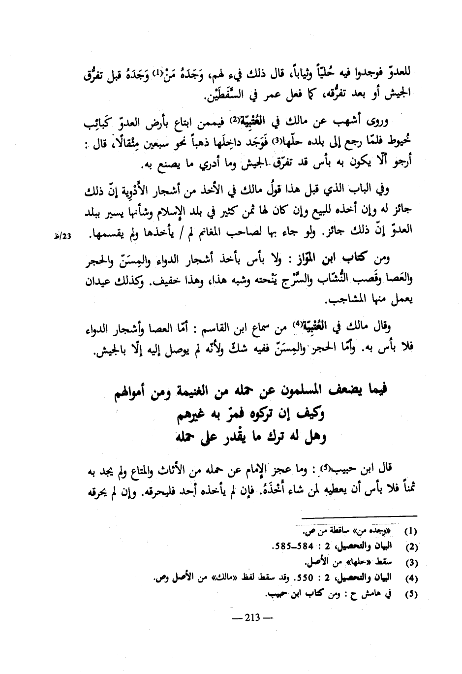 ودليل آخر أنه لو كان السلب مستخرجة من جملة ما أوجب من الغنيمة لأهلها، لم يؤخر النبى صلى الله عليه وسلم البيان فيه عند الحاخة إلى بيأنه، لأن هذه إلاية نزلت فى شأن خيبر أو النضير فلم يكن يؤخر بيأنه إلى يوم حنين، ففى حنين قال: من قتل قتيلاً له عليه بينة فله سلبه، بعد أن برد القتال. ولو كان أمراً متقدماً لعمله أبو قتادة الذى قتل قتيلاً يوم حنين، وهو من فرسان النبى صلى الله عليه وسلم وأكابر