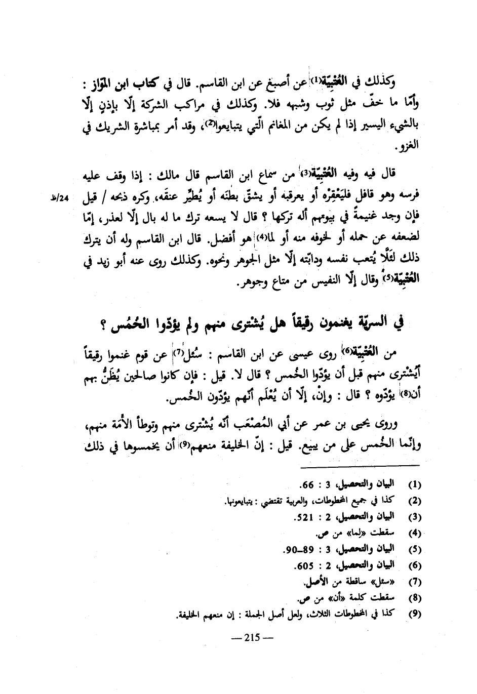 ومنه من كتاب ابن حبيب قال: وأهل الشام يرون السلب لمن بارز خاصةً نفله الإمام أو لم ينفله، ولا يجعلون لأحد سلباً فى هزيمة ولا فتح. والأمر على قول أهل المدينةرأنه من الخمس إذا قاله الإمام.