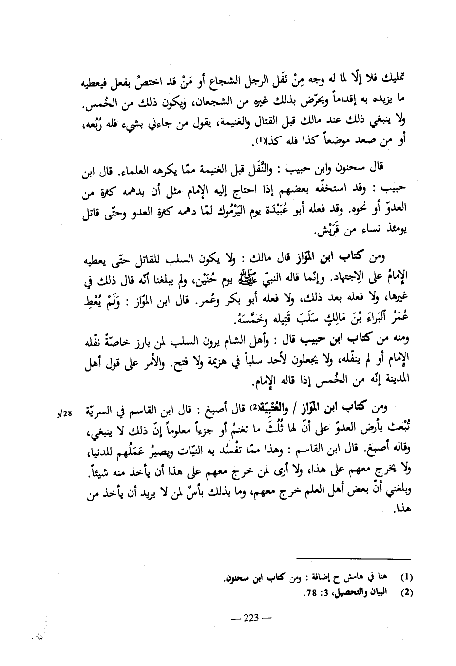 من أصل الغنيمة للاختلاف فيه. فلو ظأنه قال من تقدم إلى الحصن فله كذا أو إلى الباب فله كذا فليعطهم ما قال. وكذلك الصائفة يبعث أميرها سرايا على أن لهم الثلث بعد الخمس، أو قال قبل الخمس، فأنه يمضى ويعطون ما قال، ويدخلون فى السهام فيما يبقى بعد الخمس منه.