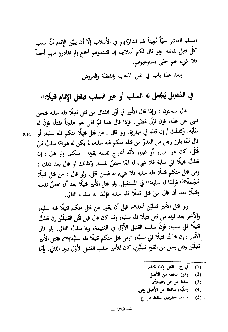وإن قال من أصاب ذهباً أو فضةً فهو له فأصاب سيفاً محلى، فإن كانت حليته تبعاً يسيرةً فلا شىء له. وإن كان النصل تبعاً فهو له. وكذلك ما حلى من سرج ولجأم أو مصاحفهم. وكذلك أبواب فيها مسأمير ذهب أو فضة يسيرة فلا شىء له.