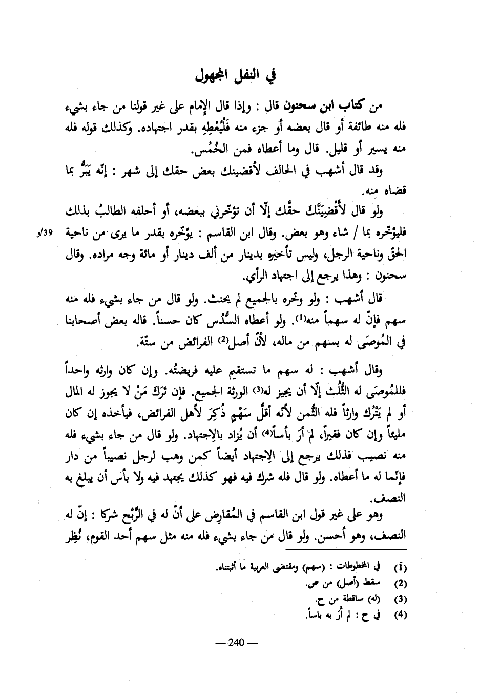ومن مات من أهل السرية قبل القسم وبعد الغنيمة أو قبل فتح الحصن ثم فتح فى ذلك القتال فحقه فى النفل والمغنم لورثته. ومن مات ممن فى العسكر دون السرية فحقه فى غنيمة السرية موروث.