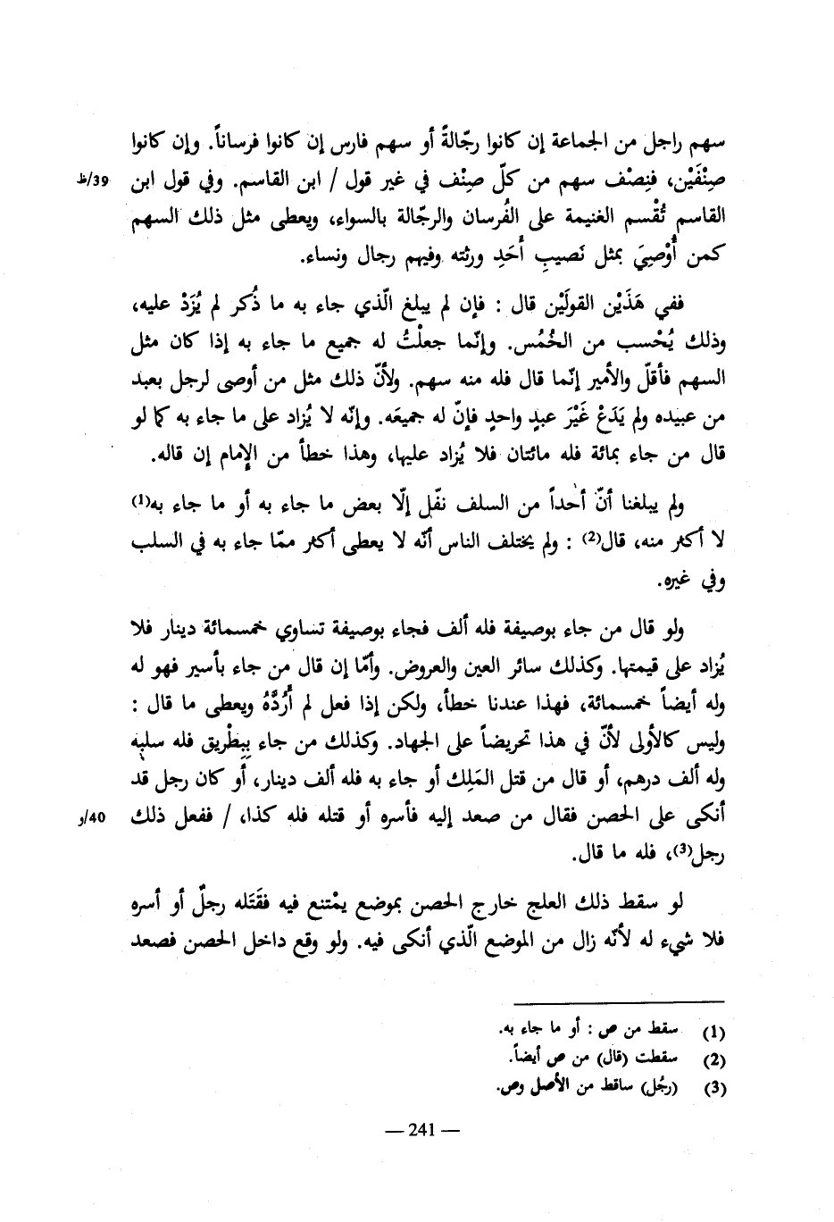 وإذا انقطعت عن العسكر أياما حتى لا يكون لها فيه رد ثم سرت سرية منهم فغنموا، ورجع الجميع إلى أرض الإسلام ولم يروا العسكر، فأنه يبطل نفل السرية الأولى لأنقطاعهم عن العسكر، فبطلت إمارته عليهم وحقه فيهم، وبطل نفل السرية الثانية لأنها بنفل أمير السرية، إلا أ، يرضى لهم أهل السرية الأولى بذلك.