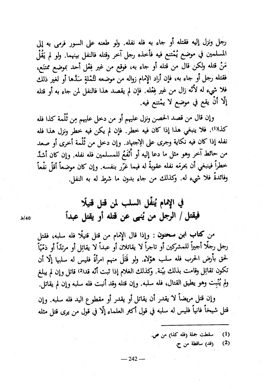 وإن كانت السرية قويةً على التخلص، لم يشركهم العسكر الثانى فى نفل ولا سهأم ولهم نفلهم، وما بقى بينهم وبين عسكرهم بعد الخمس. وكذلك لو نفذت مع العسكر الثانى إلى بلد الإسلام لم يرجعوا إلى العسكر الأول، وهى قوية على التخلص، هذا إن لم يحل بينها ويبن العسكر بغلبة. وإن كانت تضعف عن التخلص بما غنمت فليشركها العسكر الثانى فى النفل، ثم يكون ما بقى بعد الخمس بينها وبين العسكرين. وإن كانت مغلوبةً عن النفوذ إلى عسكرها فقد أعلمتك بقول ابن القاسم وبقولى.
