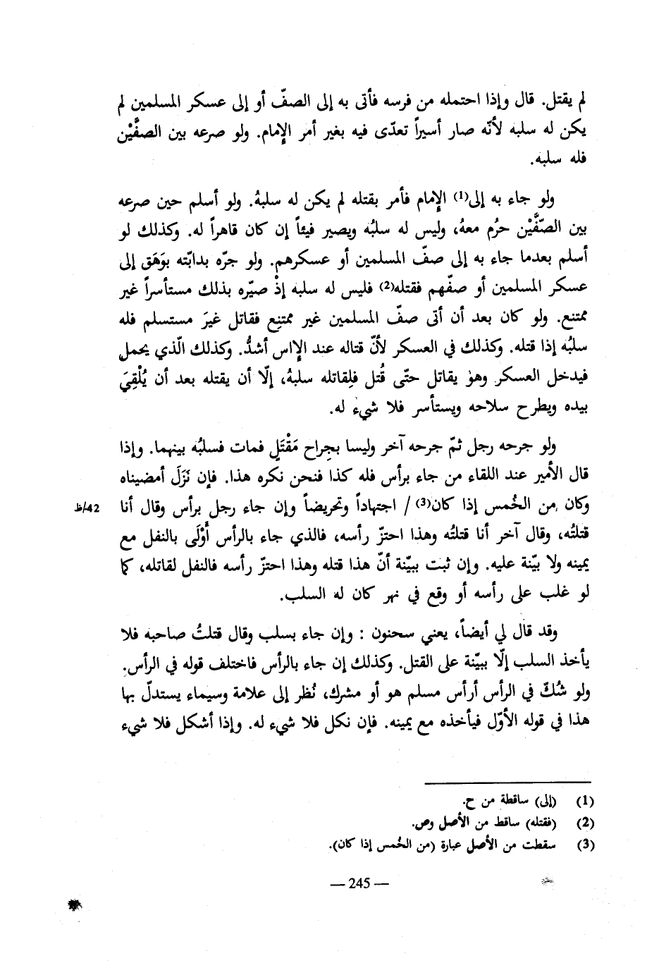 قال سحنون وكذلك لو قال من أصاب منكم شيئاً فهو له لم ينظر إلى هذا وقسم ذلك بين جميع أهل السرية بعد الخمس وفرق أهل العراق فى ذلك بين الطليعة مثل إلاثنين والثلاثة وبين السرية فى عتق القرابة وعتق من أعتق منهم نصيبه، ولا فرق عندنا بين ذلك.