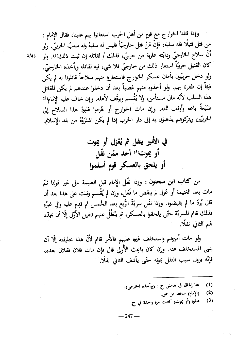 وإن قال: من قتل قتيلاً على بغل فهو له فكانت بغلة فهى له. ولو شرط على بغلة لم تكن له إن كان بغل. وإن قال على حمار فكان أتان فهى له. ولو قال على أتان أو على حمارة فكان على حمار ذكر لم يكن له. وكذلك يفترق فى البعير والناقة فذكره للناقة يمنع من أخذ الذكر. وإن قال من قتل فارساً فله دابته فقتل من تحته بغل أو حمار أو بعير فلا شىء له. وإن كان تحته فرس أو برذون ذكر أو أنثى فهو له.