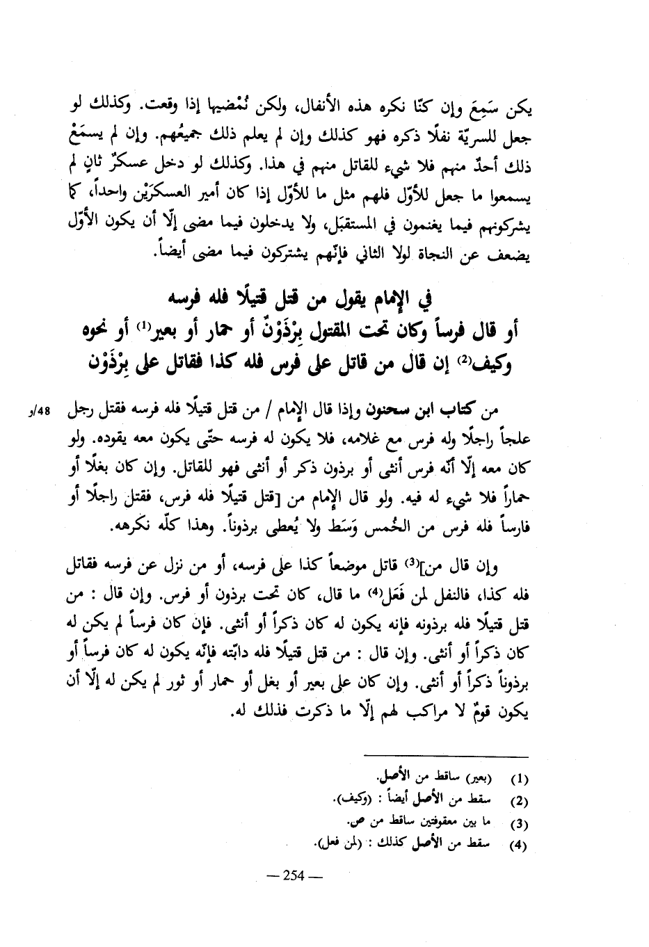 من كتاب ابن سحنون: وما أحرزه العدو من مال مسلم أو ذمى بغنيمة أو عبد أبق إليهم فغنمناه فوقع فى سهمان رجل فلا يأخذ ذلك ربه إلا بالثمن. فإن كانت أمةً فأولدها من وقعت فى سهمه أو أعتقها فقد فاتت ولا سبيل لربها إليها. قاله انب القاسم وغيره. وقال أشهب: هى كالمستحقة ويأخذها ربها ملكاً ويأخذ قيمة الولد. وقاله ابن القاسم، ثم رجع. قال ابن نافع: ولو وهبت ولم يثب عليها فربها أحق بها ويرد العتق. وإن أثاب عليها شيئاً أعطاه ما أثاب. ومن اشترى منهم أمةً وعرف أنها لمسلم لم ينبغ له وطؤها، اشتراها منهم فى بلدهم أو فى بلد الإسلام.