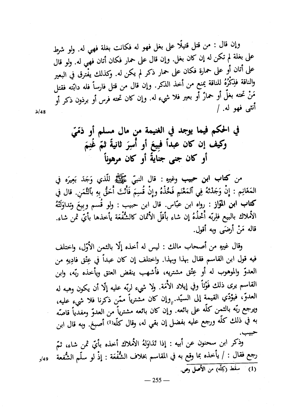 ومن كتاب ابن سحنون: قا ل سحنون: ولو أخذ العدو عبيداً نصارى للمسلمين فصالحهم الإمام منهم على ثمن، قال: يكون ذلك لأرباب العبيد ولا يكون مغنماً. ولو أن العبيد مسلمون لم ينبغ للإمام أن يأخذ فيهم المال فإن فعل لم أر للسادة أخذه ولا أحب لأهل الجيش أن يقتسموه. وروى ابن أبى حسان عن ابن القاسم قال: وإن أخذ المشركون رقيقاً للمسلمين فصالحهم الإمام على ثمن أخذه منهم، فليس لاربابهم أخذ المال، وكأنهم وقعوا فى المقاسم فلا يأخذهم إلا بالثمن.