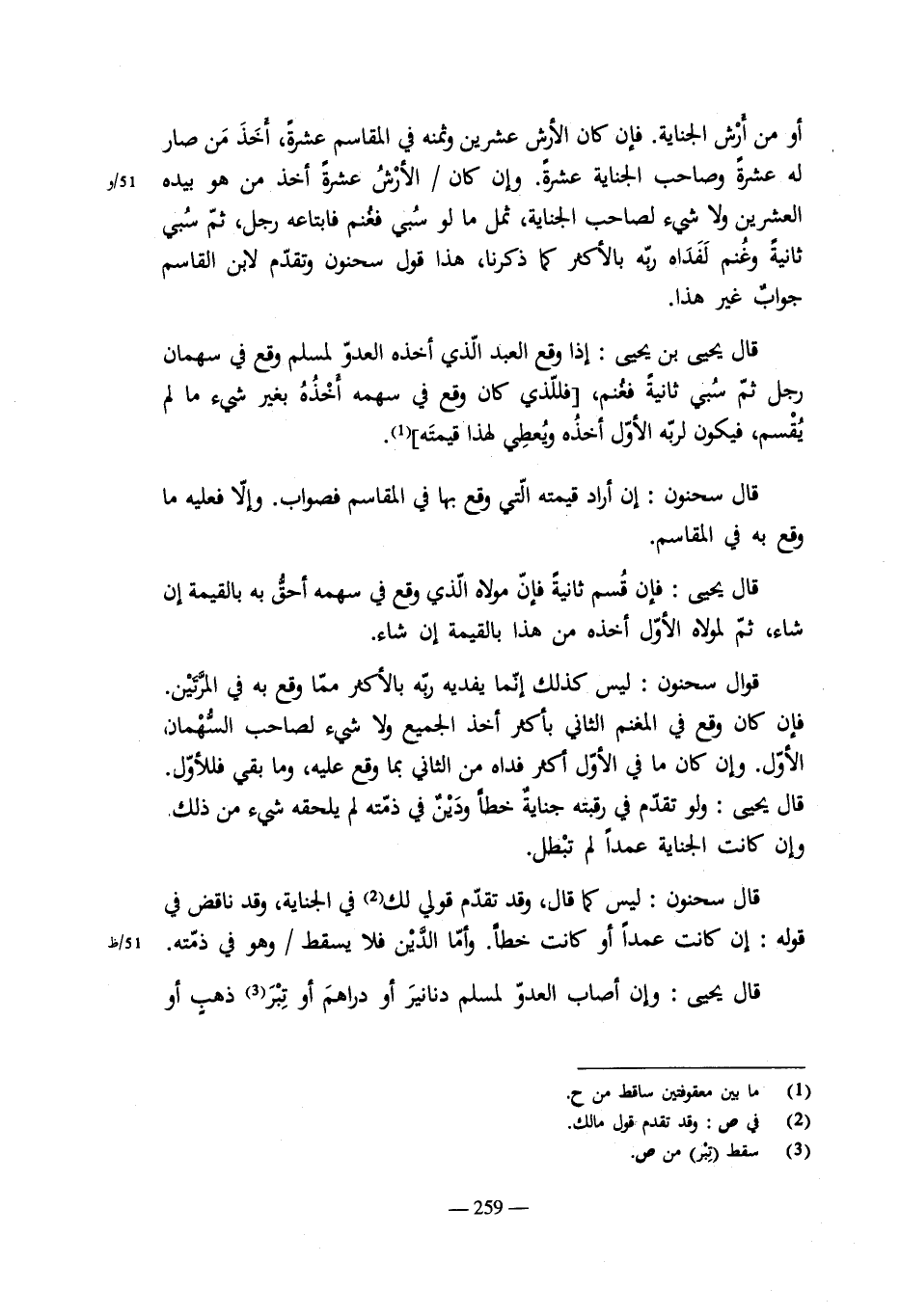 قال سحنون: ولو وطئها، ثم سببت فوطئها علج ثم قدم بها فأسلم عليها. فإن وطئها العلج بعد زمان فيه استبراء لرحمها فالولد ولد العلج. وإن وطئها فى طهر فوضعت لما يشبه أن يكون منهما دعى له القافة، فإن ألحقوه بالمسلم لحق به وجرى فيها حكم أم الولد. وإن لحق بالحربى لحق به ولا شىء عليه فيها، كمن أسلم على عبد بيده لمسلم. وإن قالت القافة اشتركا فيه، فابن القاسم يقول: يوإلى إذا كبر أيهما شاء.